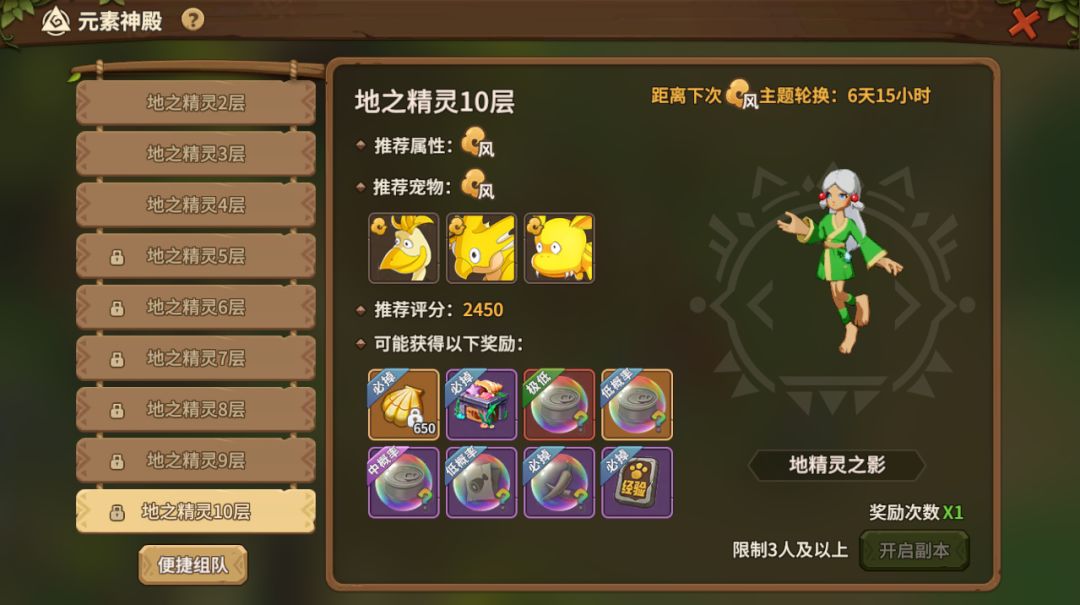 每周一五点更新次数,一周内可以无限参与,但每层每周只能获得一次奖励。进行挑战需要选择克制该神殿的属性和宠物属性,《石器时代:觉醒》中元素属性分为火、风、地、水四种属性,火克风、风克地、地克水、水克火,克制的元素最高可以造成130%的伤害,而被克制的属性只能造成60%的伤害,所以属性的选择很关键,尤其是在几人组队的情况下,不仅要保证阵容的合理性,还要选择克制该元素的属性,最起码也要选择没有克制关系的属性。