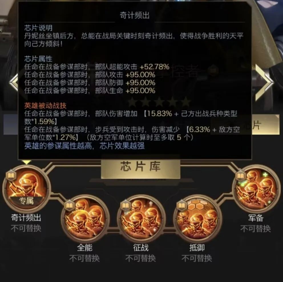 丹妮丝作为首个荣耀级参谋英雄,任命在战备参谋部可全面提升部队属性,提升部队超能攻击,被动技能还可增加部队伤害并强化步兵的生存能力。具体的技能描述如下图所示,小编不再赘述!