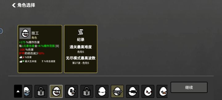 技工:武器全选着那把爆破枪,打中敌人有几率爆炸的,近战的不要爆炸率比较低,升级疯狂叠攻速和伤害就行,生命值闪避护甲这些都行,然后加点吸血,有加爆炸范围的和爆炸伤害得无脑拿,站在角落,全来全死,打死了材料不要捡,拿个捡材料的会回血的,等到没血进没捡的材料里面一走血就满了,或者快结束一回合的时候捡,到第20波,两个boss随便打