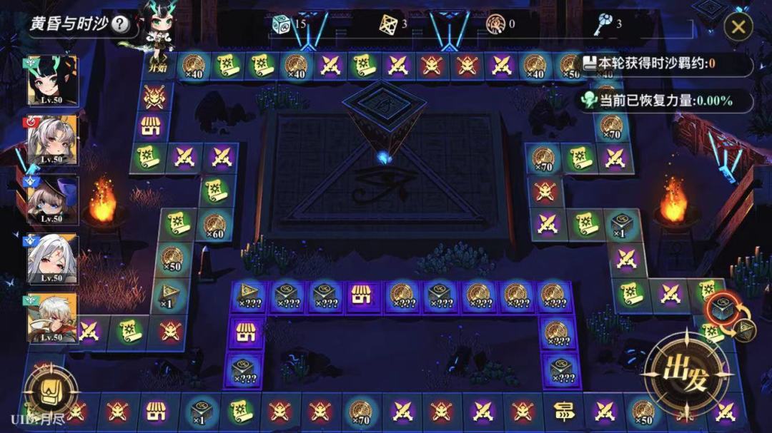 这个格子类似于平时地图的开宝箱选赐福,3选1,套装类型有很多,但一般不太用得上,这里一般建议直接选3保血量即可,因为此玩法整体难度不是特别大,但很耗时,直接选3可以有速通玩法。当然如果面板不高的情况下,可以选择加战力的赐福,但这样就不太足以支持下面的速通玩法。(赐福格子在你最大生命50以下可以酌情选择指定骰子去回复一次)