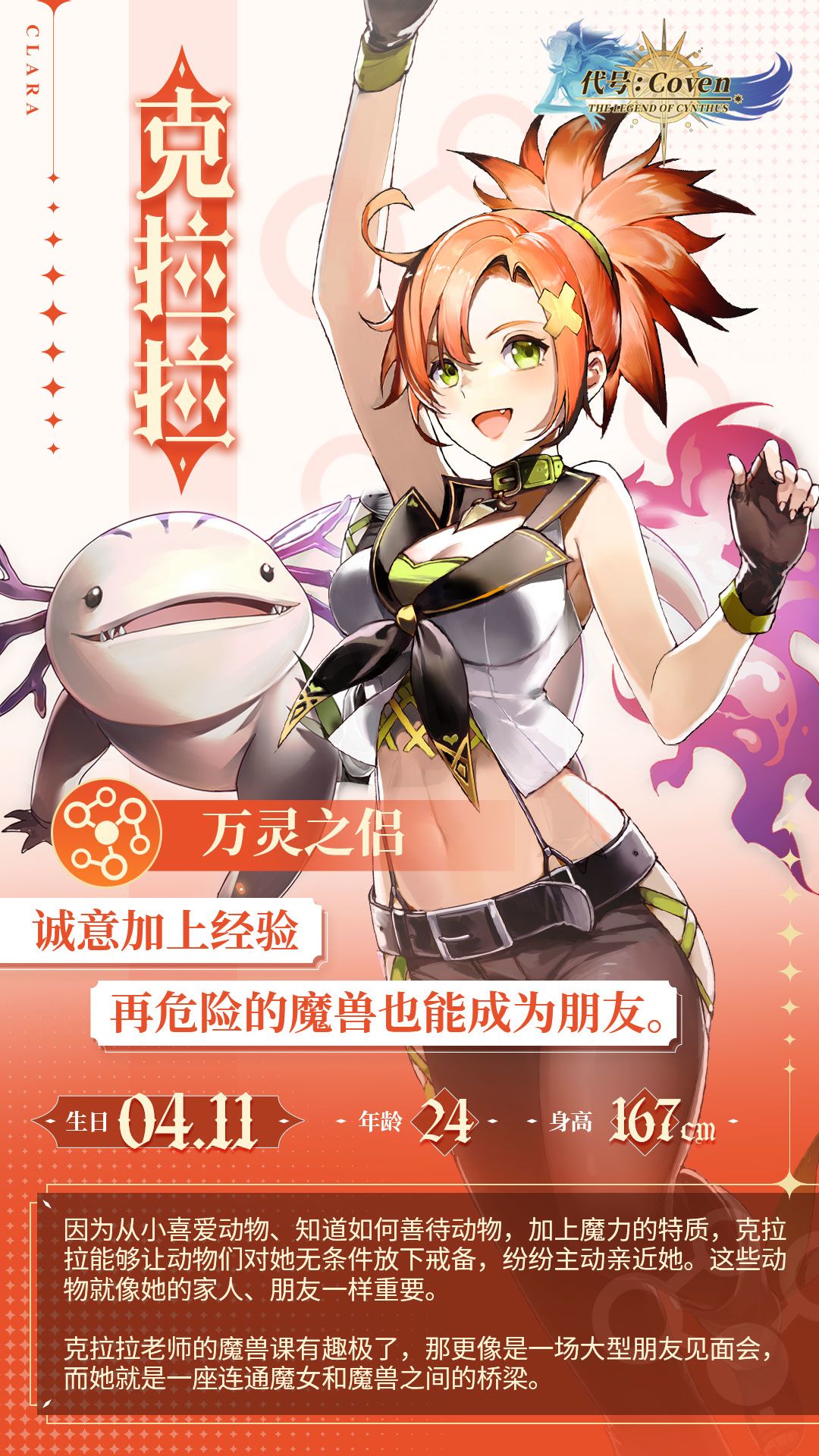 克拉拉从小就和各种动物成为了好朋友,她似乎能听得到动物们的交谈,也能让各种飞禽走兽理解她的想法。每当你好奇克拉拉是如何不运用魔力就让动物乖乖配合时,她都会搬出她的拿手武器:“爱!你得先从心底里喜欢这些小可爱们!”。