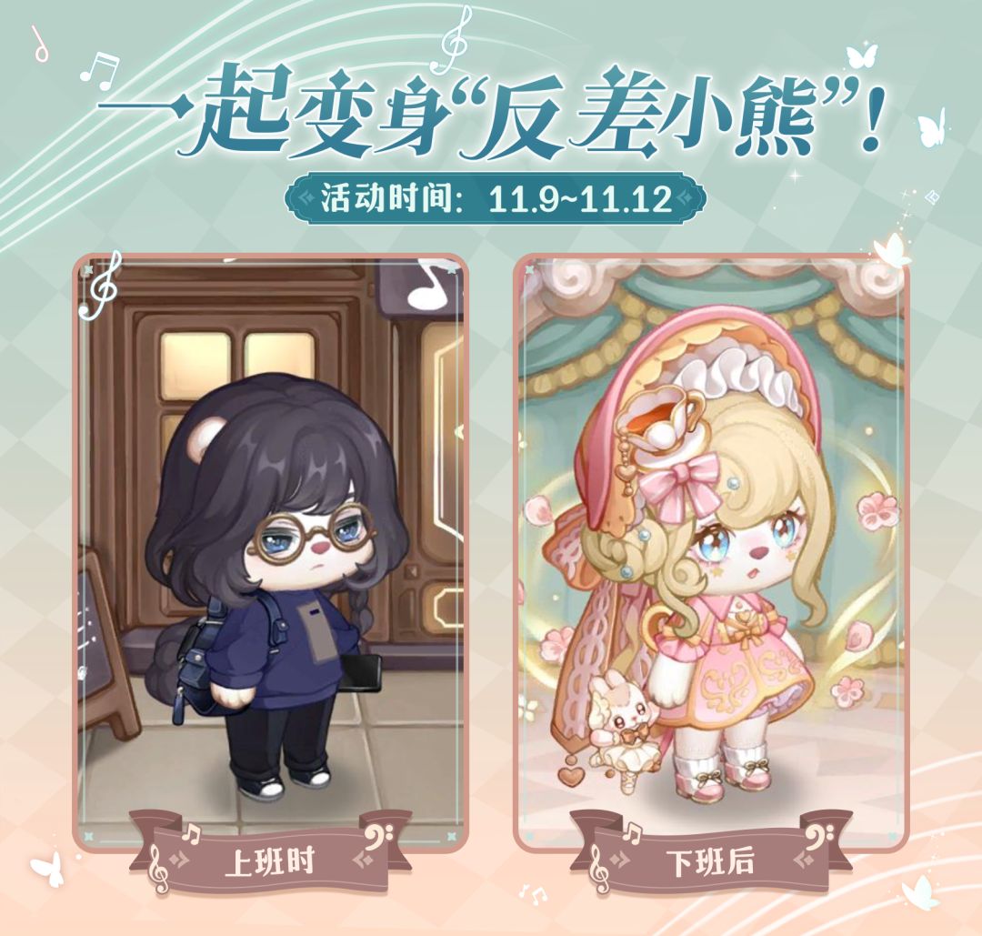 听说每个小熊心里都有着另一种风格,有的熊表面看起来是温柔甜妹[可爱],实际上私底下却是冷酷拽姐一枚[酷]没有熊能够拒绝这种反差感!2.4「雾月交响」版本即将开启,快来和兜兜分享你的“反差”创意穿搭吧!