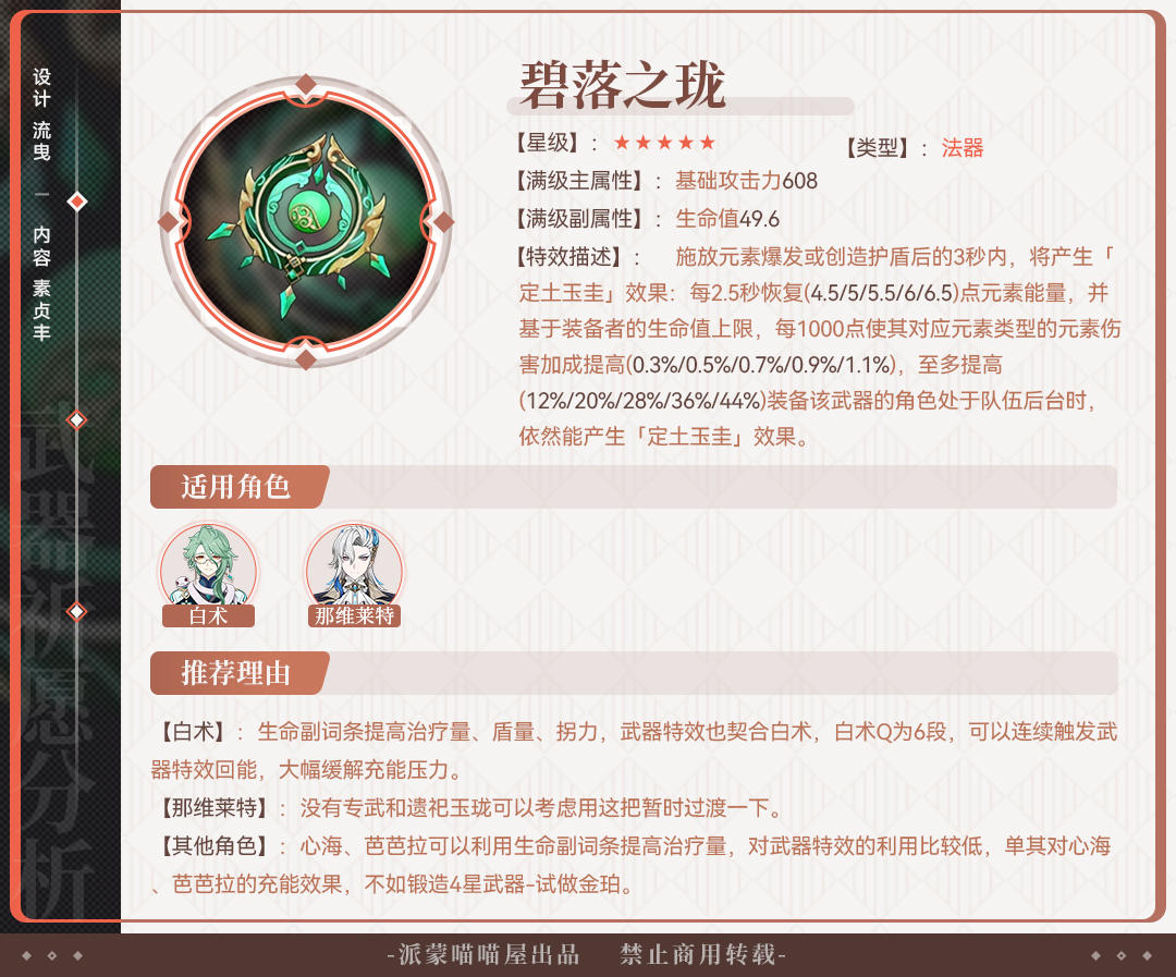 碧落作为一把限定五星武器,生命副词条,高白值,泛用性低,,所以不建议去抽取这把武器。
