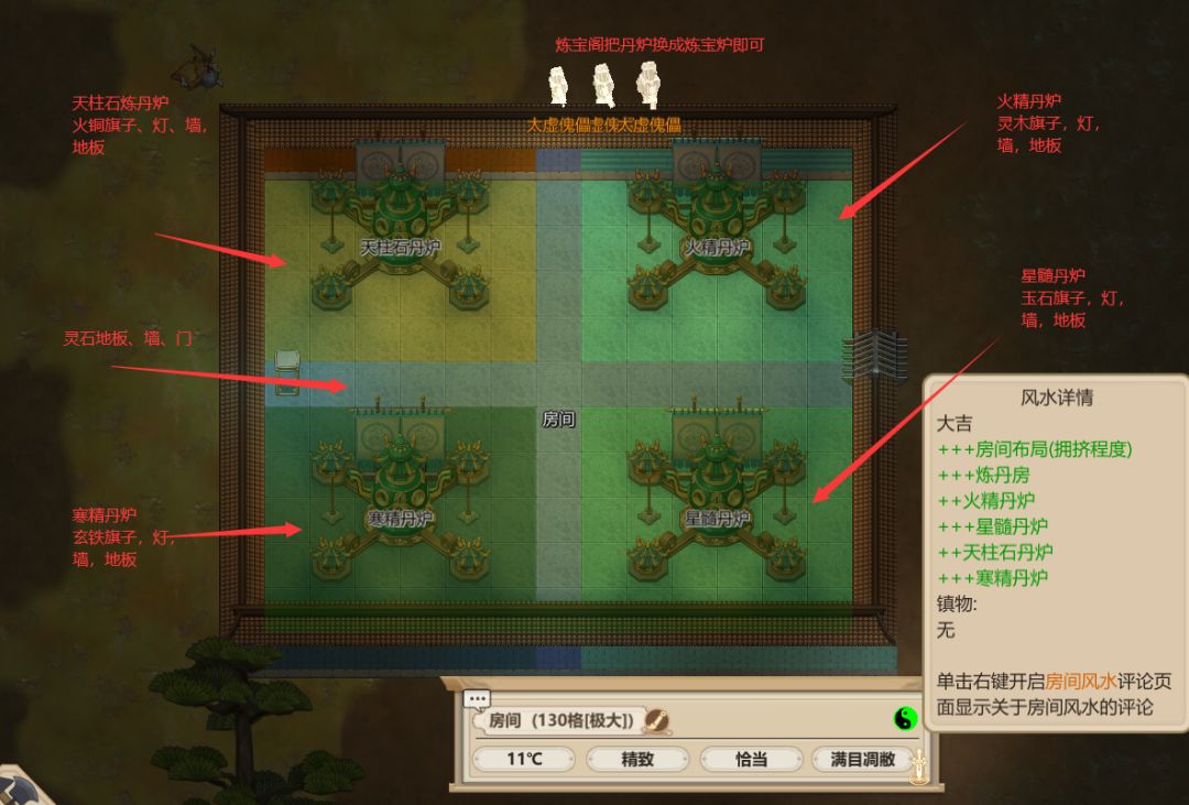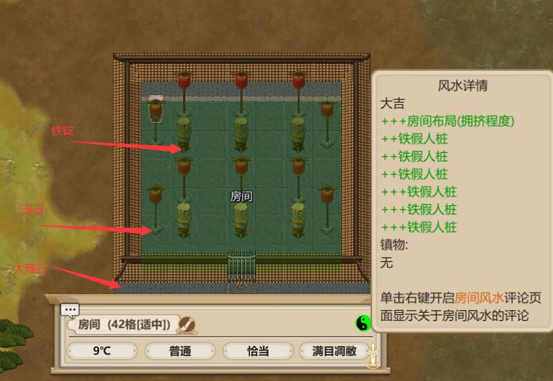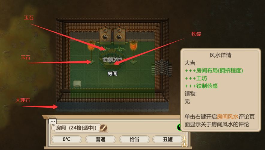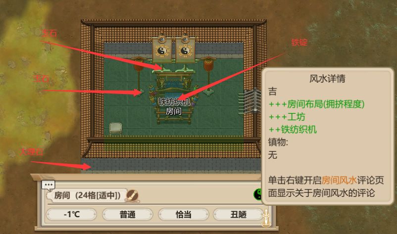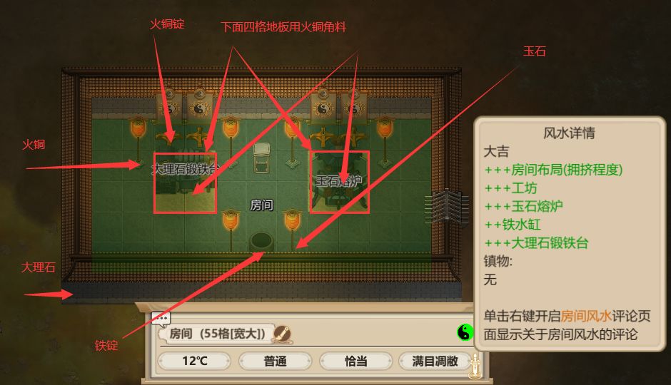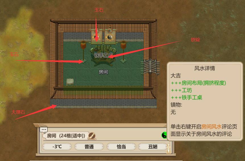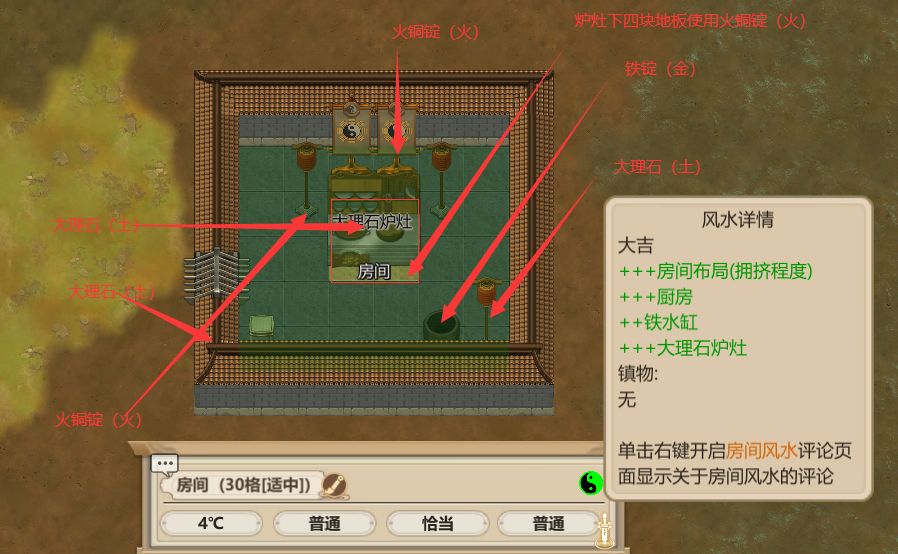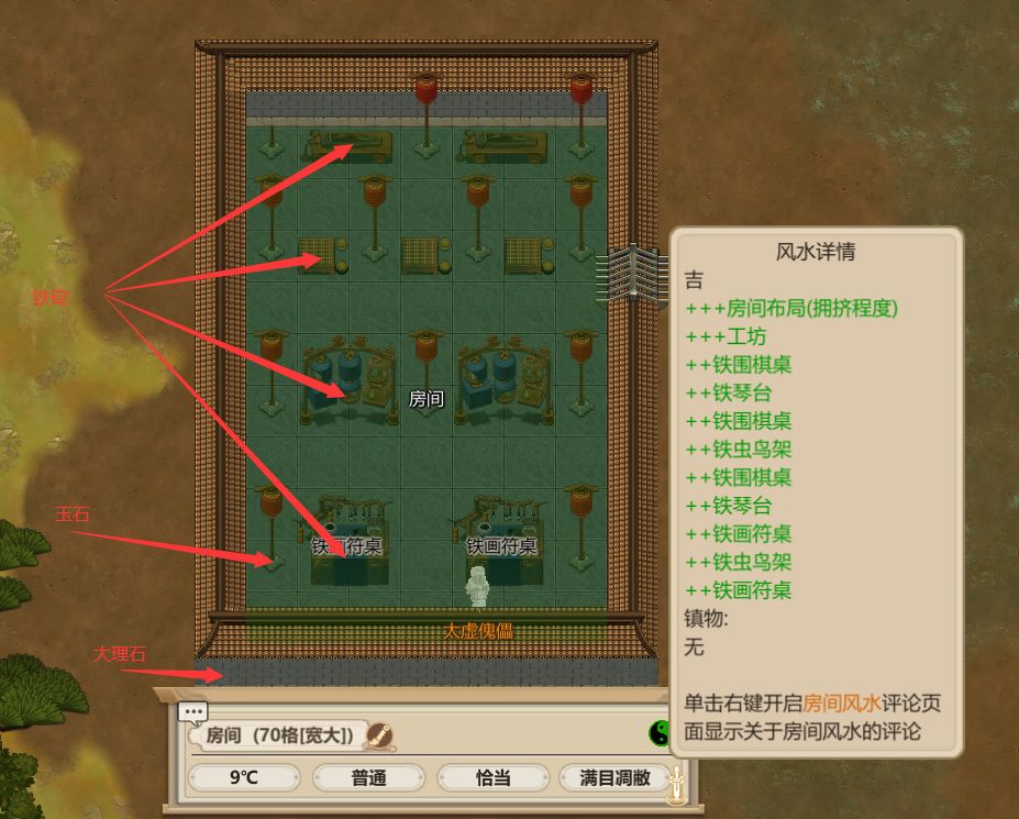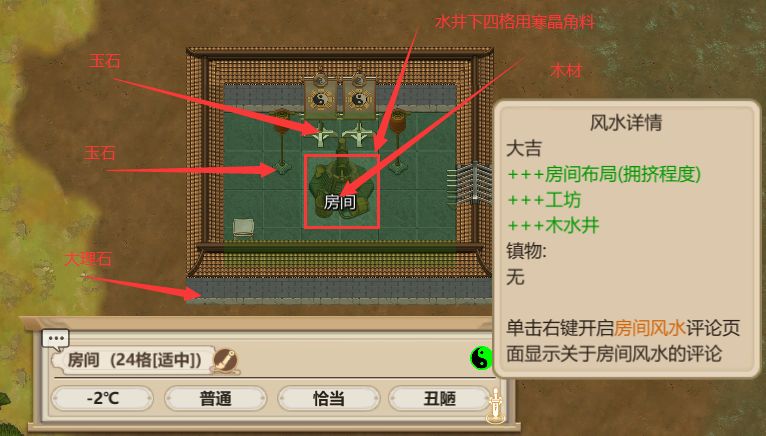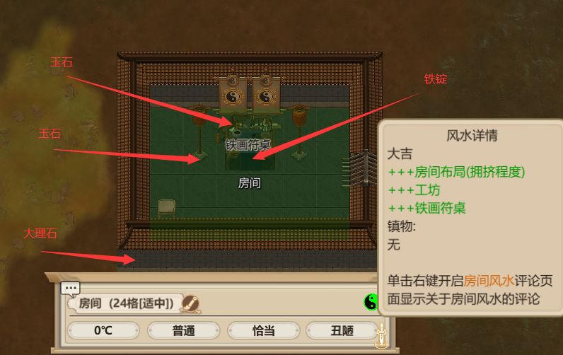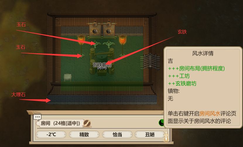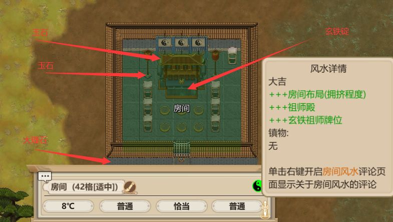 拿上图来举例,游戏中通常建造的小人卧室床都会使用金属性的材料来制作例如铁锭、玄铁锭,那么床作为风水建筑的属性就是金。根据五行相生相克的原因,我们若想使这个床的风水为吉则需要在床的周围摆放一些生金属性的装饰建筑(土属性)来调节此地的风水,使其达到大吉的最低值。