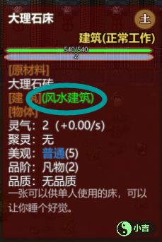 一般来说,生活(床,桌子,水缸,墓地等),工作(铁匠台,伐木桌等),门派(炼丹炉,炼器炉等),娱乐(虫鸟架,围棋桌等)中的大多数蓝图都属于风水建筑,风水建筑的小提示上会有“风水建筑”的字样,并且风水建筑的名称颜色会有所不同。风水建筑的风水会随着所在位置的五行分布变化而改变。建筑的五行属性与建筑地点的五行越匹配,风水越好。