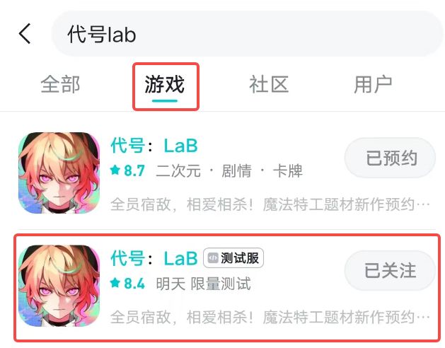同时也可以在taptap中搜索“代号lab”,在游戏中找到“代号:LaB(测试服)”进行下载