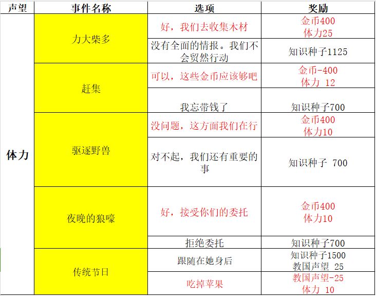 对应的事件选项表如下:刷对应事件只需要记住标黄色底的事件名称即可,然后需要加声望的选红色字体的选项,需要减声望的选绿色字体的选项。当3个都是无用事件的时候就可以点刷新了。