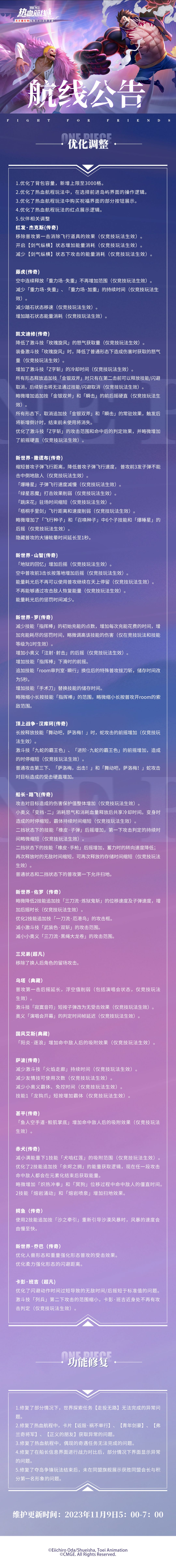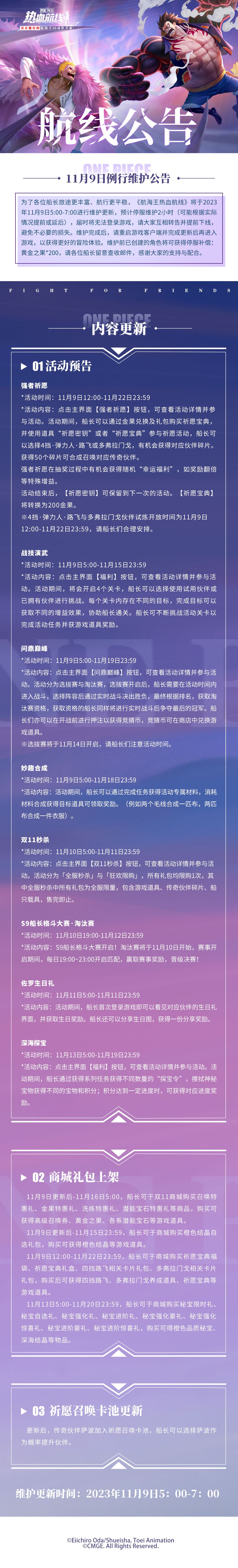 为了各位船长旅途更丰富、航行更平稳,《航海王热血航线》将于2023年11月9日5:00-7:00进行维护更新,预计停服维护2小时(可能根据实际情况提前或延后),届时将无法登录游戏,请大家互相转告并提前下线,避免不必要的损失。