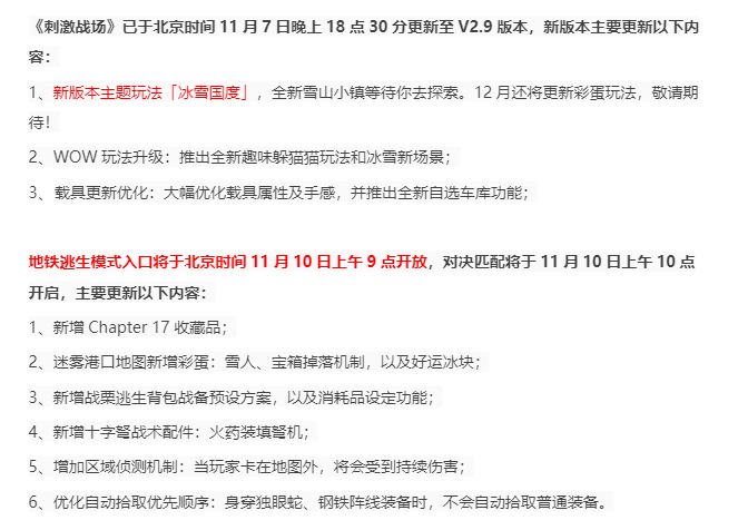 首先pubgm现在进入了赛季更新的阶段哦!所以地铁逃生暂时下架了,重新上架时间,以及正式服更新内容参考如下哦: