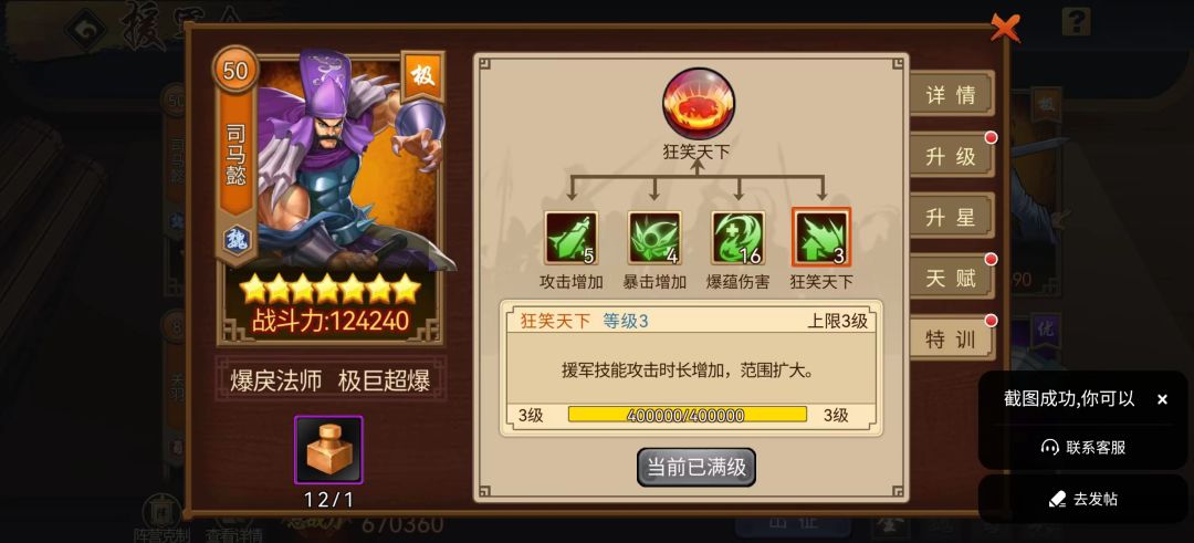 对平民玩家而言,不可能像氪金玩家一样一步到位,但很多普通玩家也在国庆节活动中成功将极品司马打造到3星并形成即战力。在其余极品援军不能一蹴而就的情况下,搭配其它两个实用型援军过渡使用,更多是考虑性价比,从易于养成的绿色和蓝色援军中选择实用援军很受用。水枪兵大招是诸葛亮必杀技复刻,召唤3艘船破倒地攻击,天赋举一反三培养到顶级,3个水枪兵在场9艘船纵贯全场、持续破倒地,可以很好的辅助主将连击和确保追加火书打满伤害的效果。张郃大招带有的吸附和易伤增益,目前玩家将其运用到军团本第八章,伤害量增益要有别于以往。