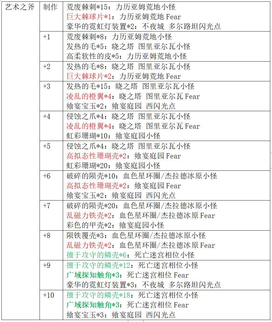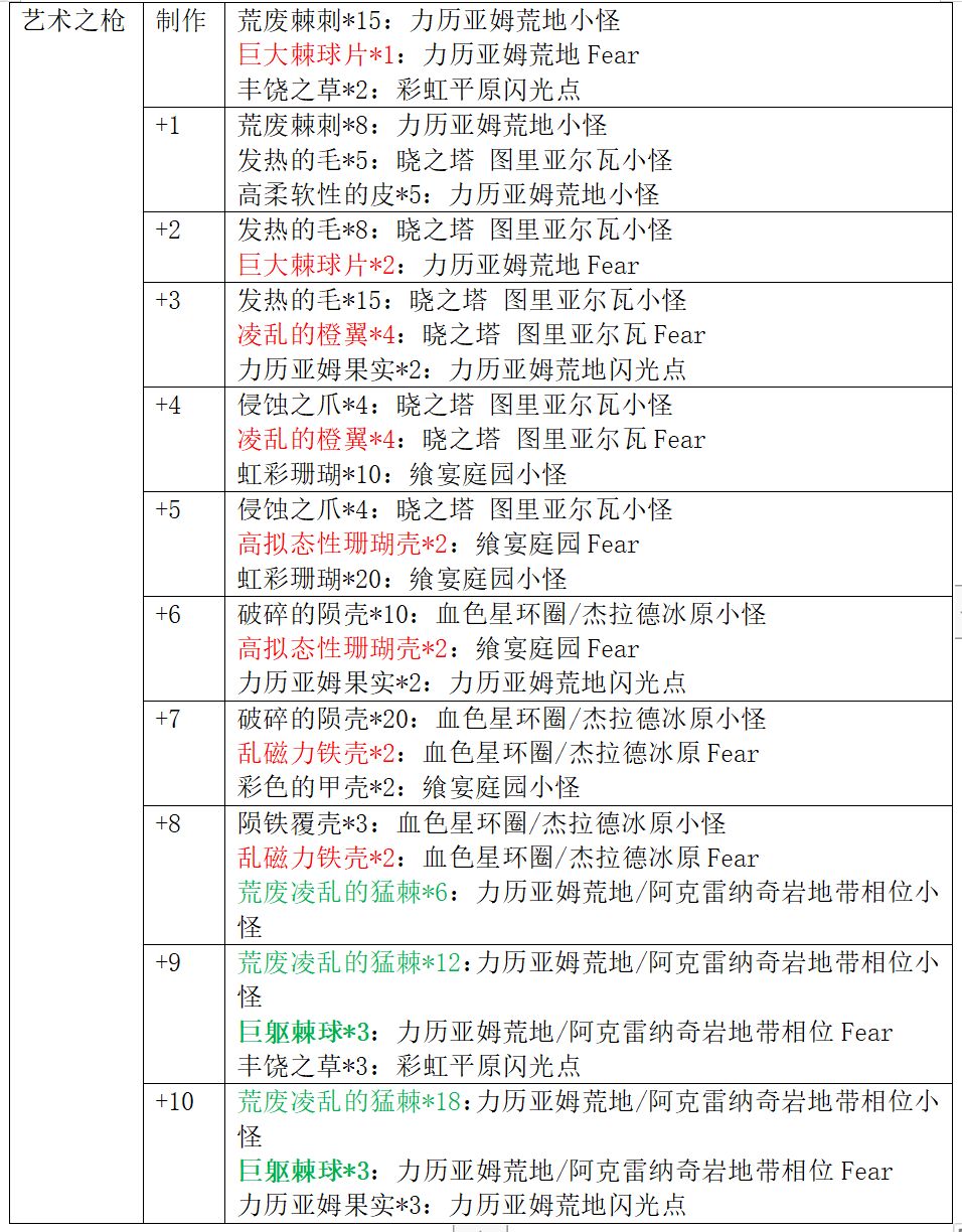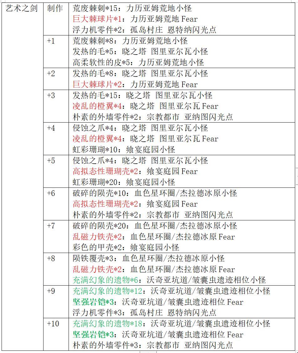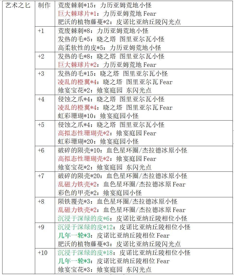 艺术系列武器获取方式:在3.0中篇野图刷取素材制作并强化(强化材料图中红色字体代表普通Fear材料,绿色字体代表相位小怪材料,绿色加粗字体代表相位Fear材料)。