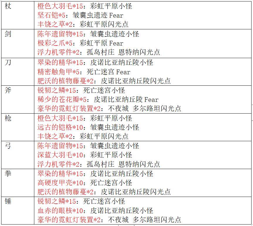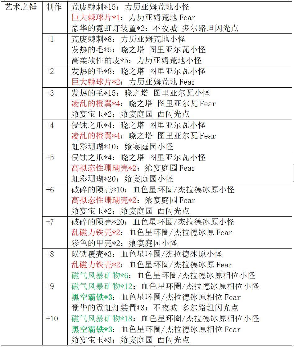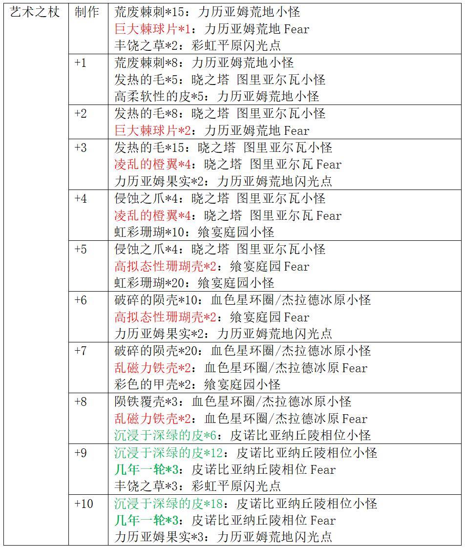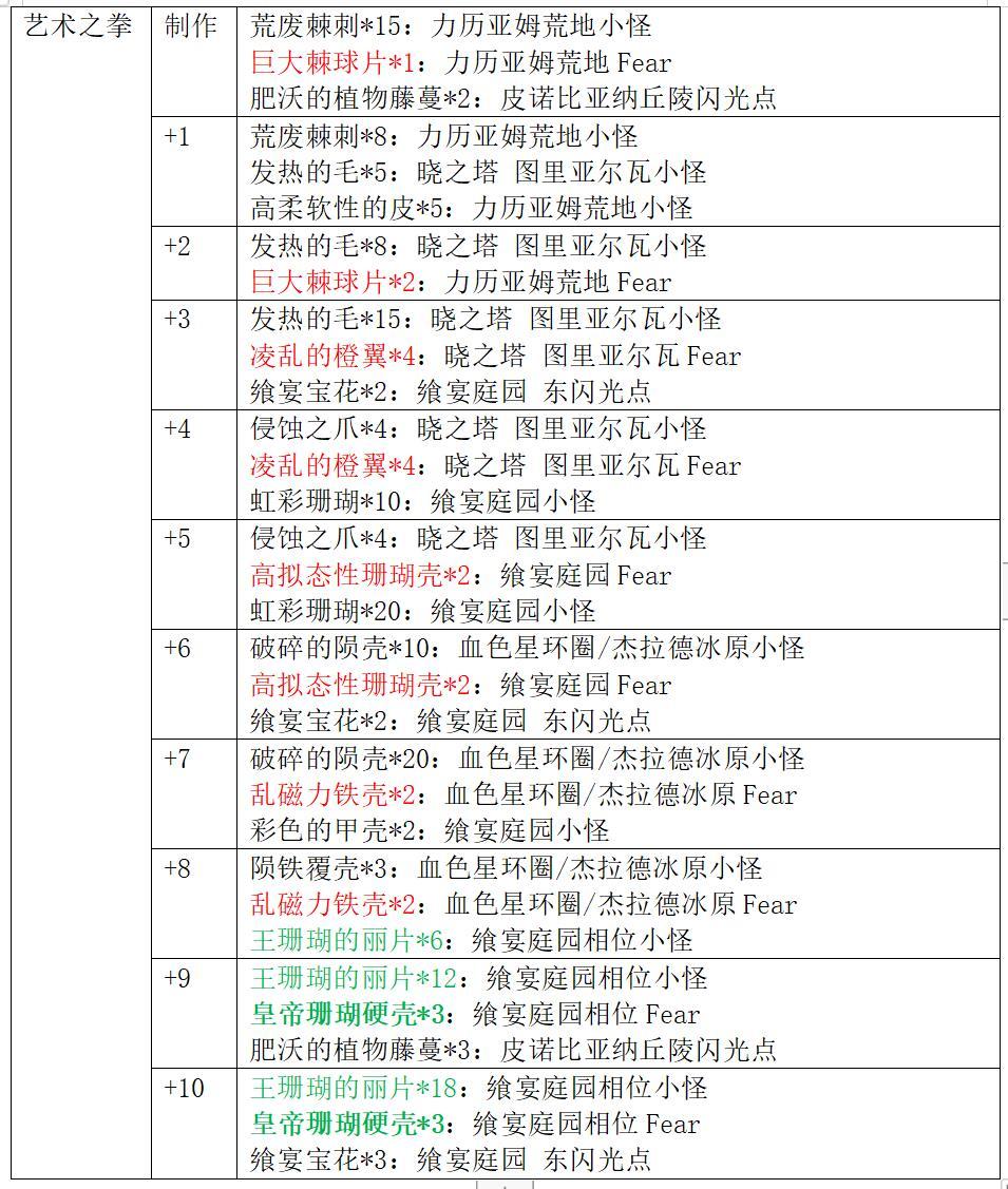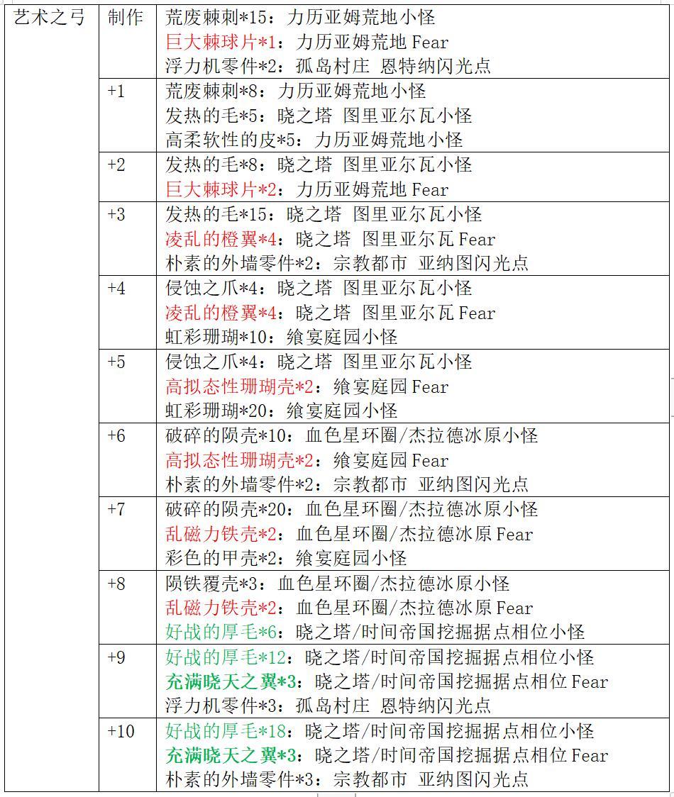 艺术系列武器获取方式:在3.0中篇野图刷取素材制作并强化(强化材料图中红色字体代表普通Fear材料,绿色字体代表相位小怪材料,绿色加粗字体代表相位Fear材料)。