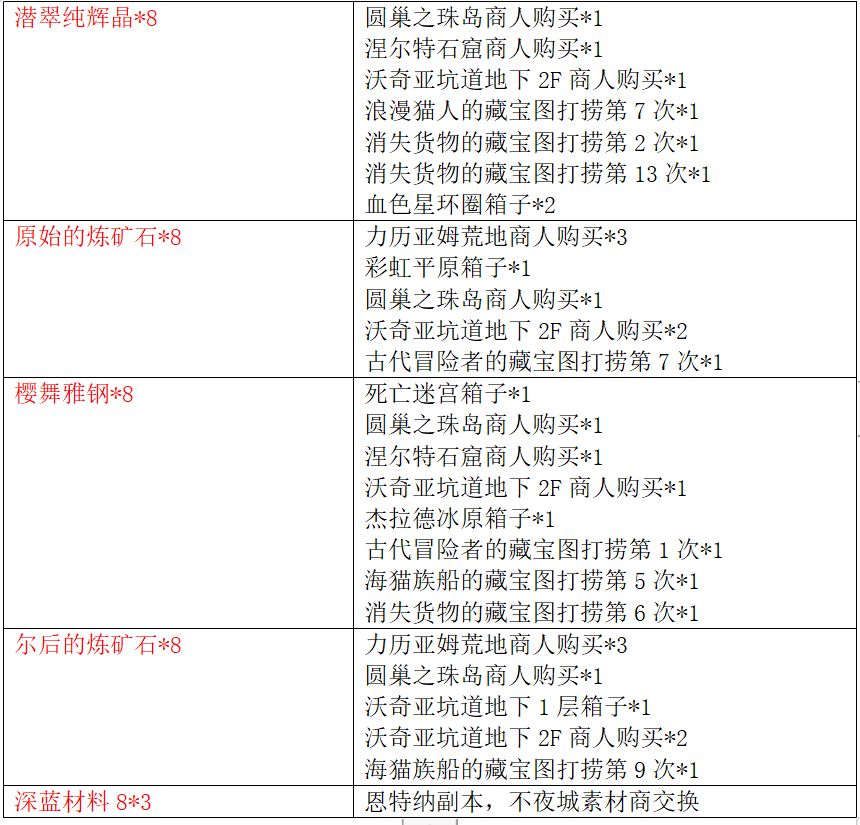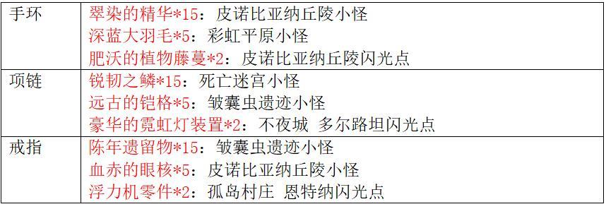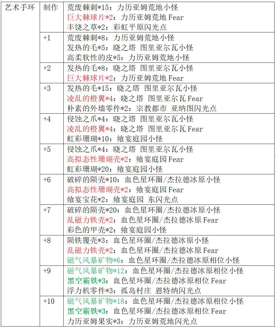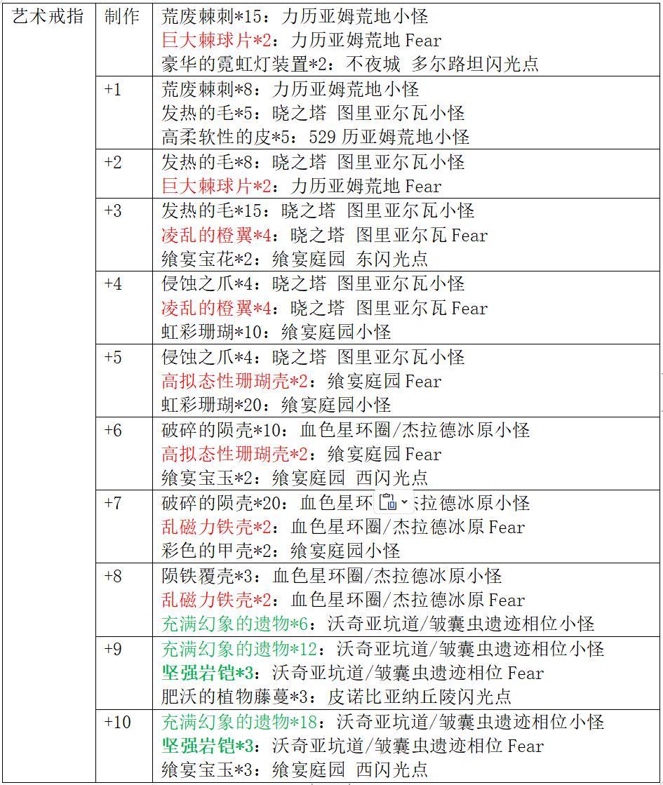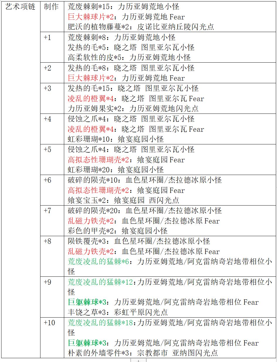 艺术系列防具获取方式:在3.0中篇野图刷取素材制作并强化(强化材料图中红色字体代表普通Fear材料,绿色字体代表相位小怪材料,绿色加粗字体代表相位Fear材料)。