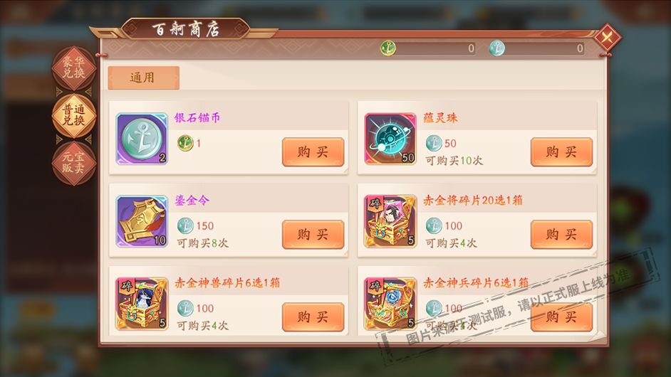 银石锚币可兑换蕴灵珠、鎏金令、赤金将碎片20选1箱、赤金神兽碎片6选1箱、赤金神兵碎片6选1箱、紫金碎片选择箱(六)、紫金装备碎片箱、星宿凝晶、八卦幻紫石、幻紫符选择箱、星魂选择箱、兵书残卷等珍贵道具。