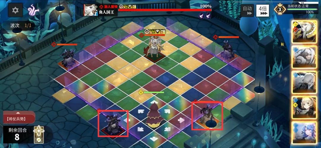 (4)BOSS打法思路与万色格的放法:主要思路是贴身BOSS打,要保证每回合都能有15格(15格就是格数伤害上限了)连线再打到BOSS;万色格尽量贴着BOSS四周十字格放,能实现在15格之后还能绕着BOSS走一圈是最理想的;如果你用了醒山、查莉娅等可以斜角普攻的光灵,就还要尽量把BOSS斜角也绕上。