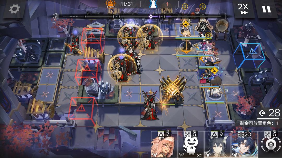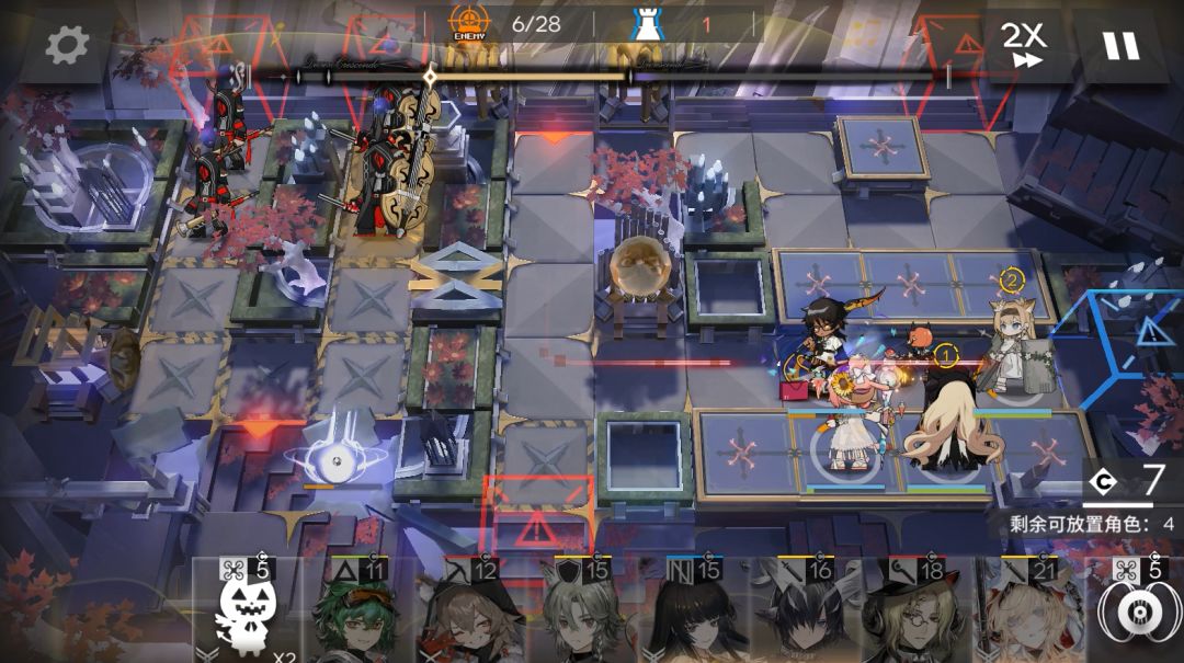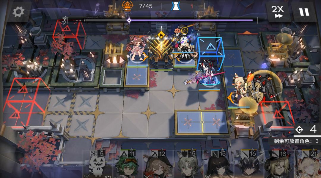 需要开装置依次部署棘刺朝左,煌朝左,然后等第一个眩晕怪到煌前面一格开装置解除对面眩晕技能,部署夜莺朝左,小羊朝右,然后等眩晕怪挂了后立刻开装置变奏,解除下面的法伤平a技能。部署小火龙朝左。后续操作同理,到29杀变成紫色就不用开装置了。