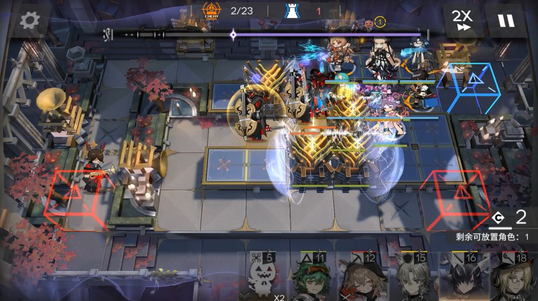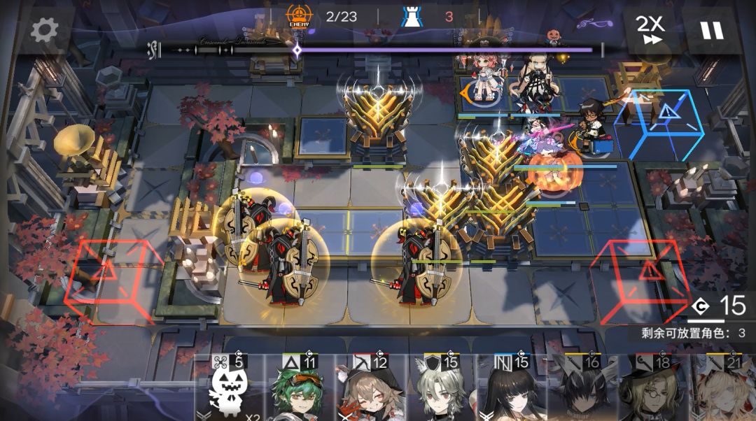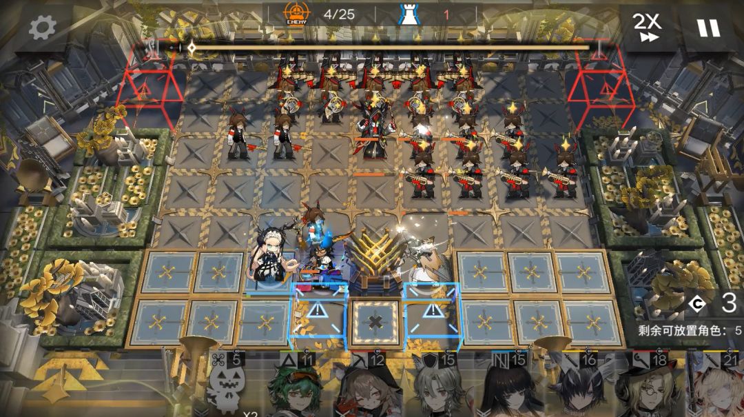 依次部署棘刺,号角朝上,夜莺朝右挂机。如果号角没开模组,会被最后的鼓手远程打死,号角刚好打不到对面。练度低的多带干员处理一下。