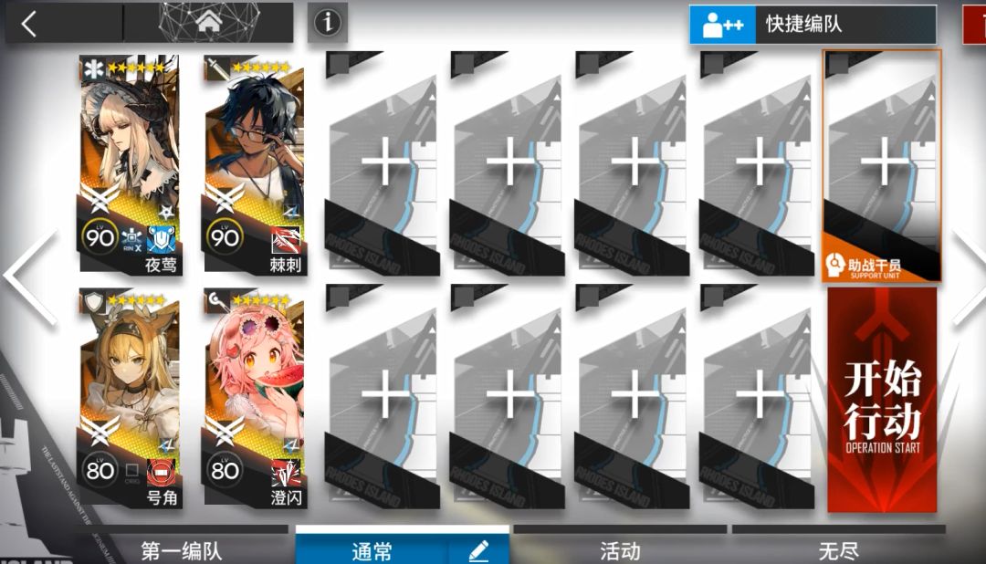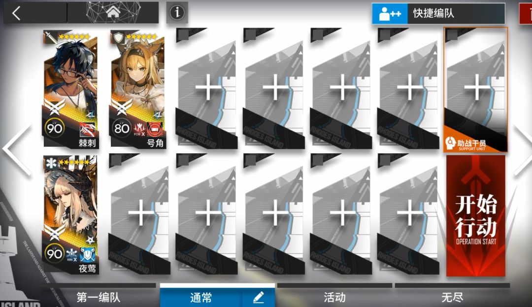 依次部署棘刺,号角朝左,夜莺朝上,粉毛朝上,练度低的最后会只有号角,可以多带个输出打对面或者重装抗伤害。