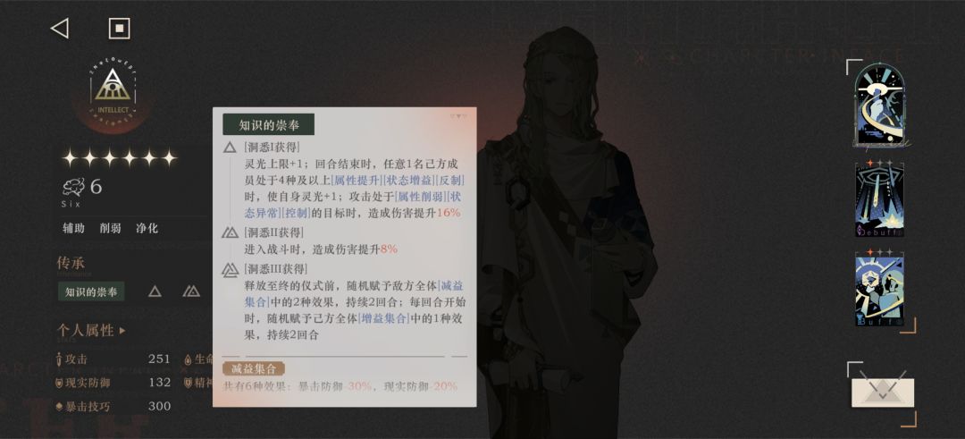 ①前言:6是一名智属性精神创伤的辅助角色,兼顾一定输出能力。强大的辅助功能是他的优点,灵光获取太慢和不搭配debuff/buff队友减益集合/增益集合过于随机是他的缺点,但是作为辅助或功能性副C来说,是非常合格的,初始300的暴击技巧也让他具有不低的伤害。