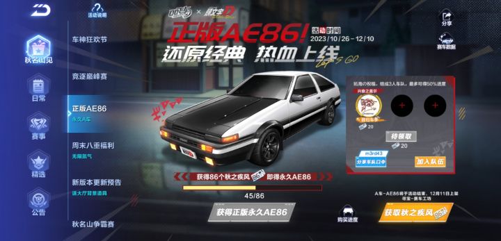 《QQ飞车手游》头文字D联动开启,正版授权A车AE86登录即得!快来组成小队,获得拓海的祝福,立得50%进度,86个秋之疾风即得永久!当前小队可领20个秋之疾风,小队口令:m3rd43,复制本段话前往游戏内【活动界面】获取~速来