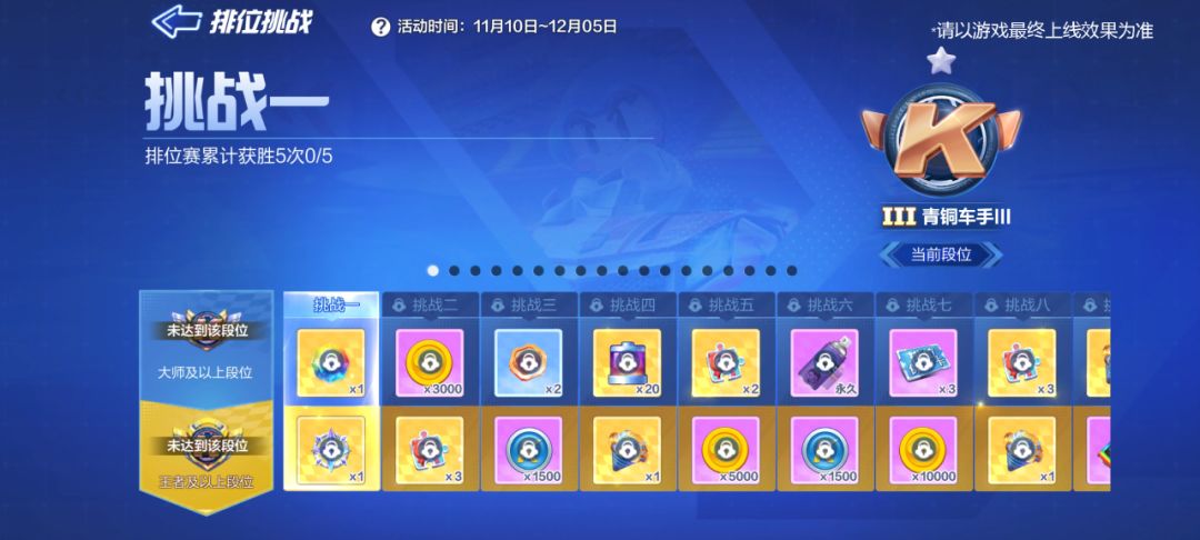 同时11月13日还将开启新图挑战赛,车友们完成新图挑战,即可获得奖励和积分。奖励包括时间沙漏、紫色幸运币和橙色幸运币,其中积分可用于兑换酷币。