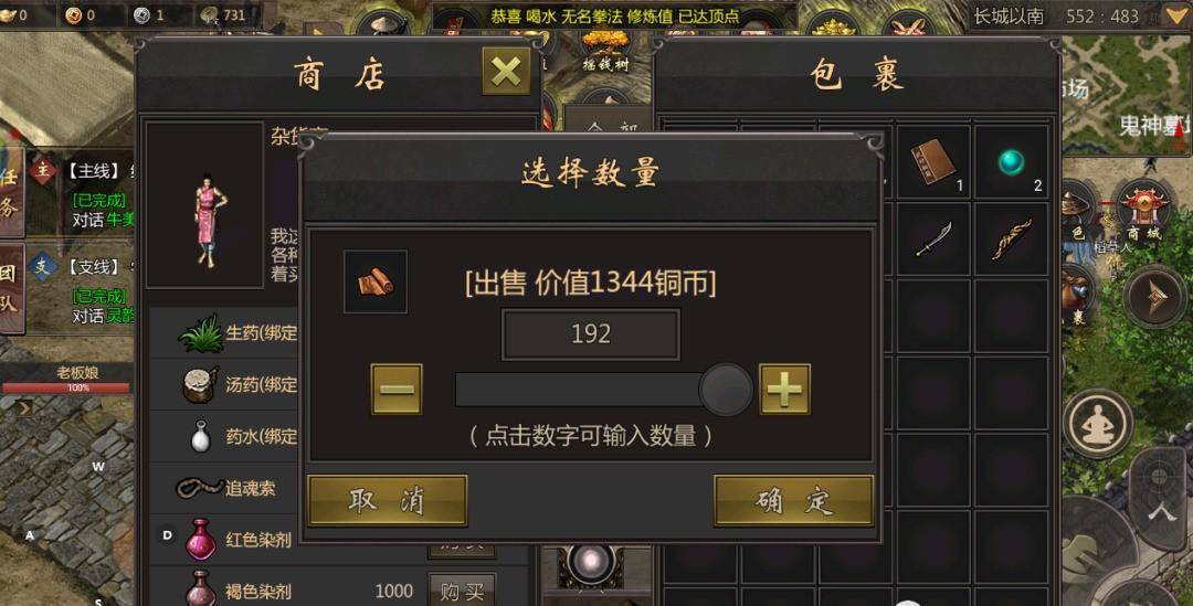 铜币获取铜币可以通过地图NPC老板娘处卖装备和物品获得(野外打怪会捡很多装备和材料)铜币可以用来买武功秘籍和要药材。