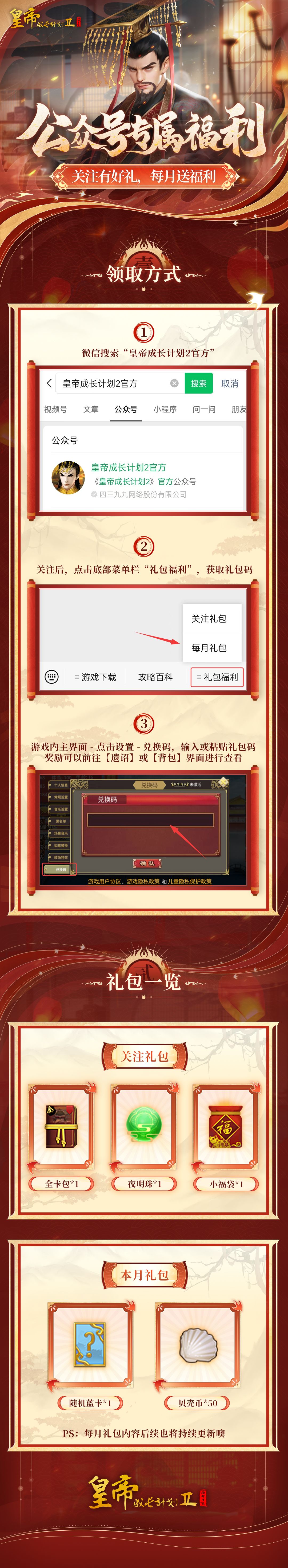 PS:本次共有两个礼包,内含全卡包、夜明珠、小福袋及其他游戏奖励,此外月礼包也会定期更新,老爷们别忘了领取哦~