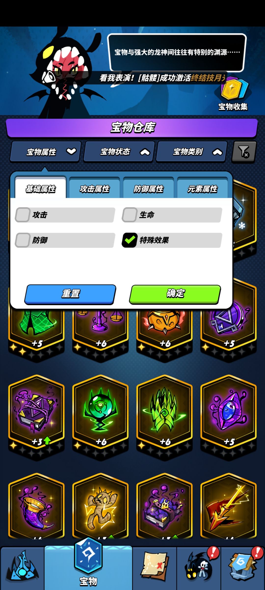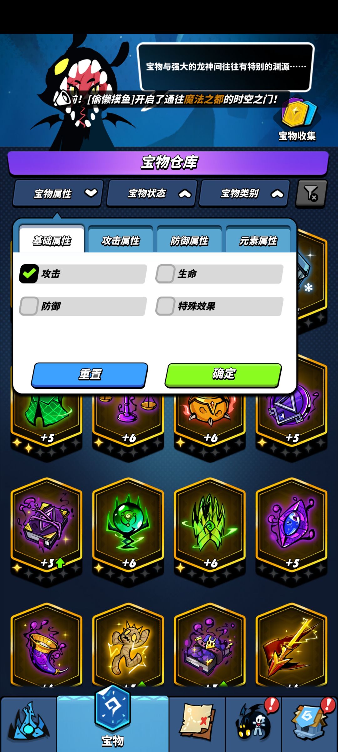 图5 为宝物界面,我们点开宝物属性勾选攻击,给我狠狠的精炼升星它们!龙骑士们,你也不想一个boss磨5-6分钟吧~当然,还是要稍微看看哪个攻击力提升高哦,这边推荐优先提升满星宝物呐,有几个蓝色宝物满星我记得加好多攻击的,嘿嘿。