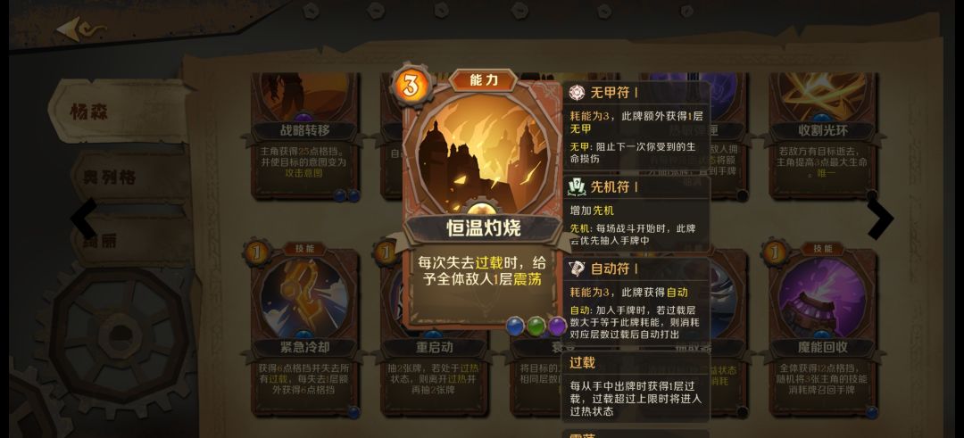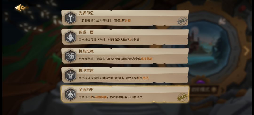 4)角色核心天赋,有翻倍的都是神技。0护甲过载3直接三连防御就是64甲,在打出第三张防御牌时先多叠甲
