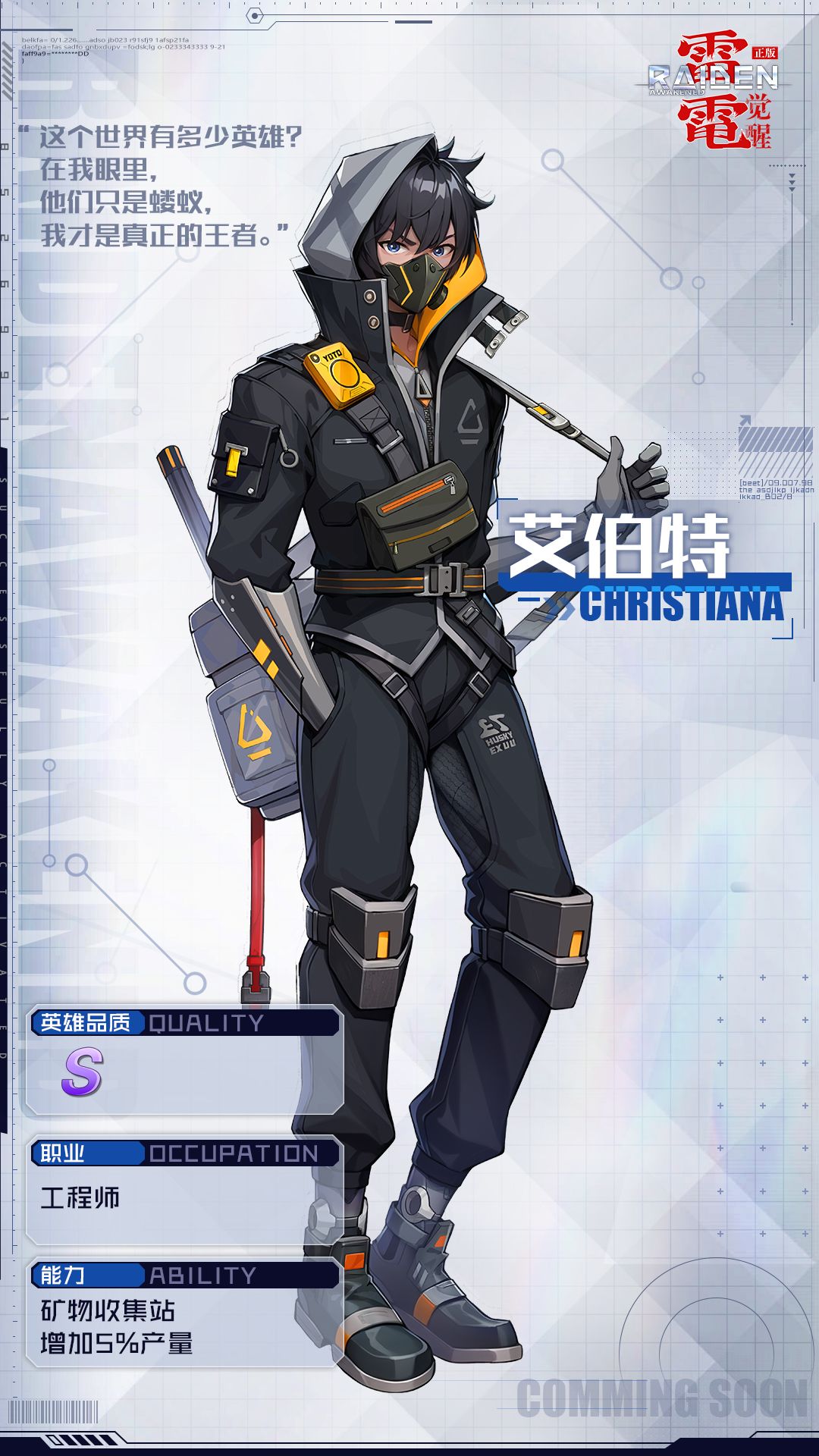 工程师丨艾伯特(Christiana)——“这个世界有多少英雄?在我眼里,他们只是蝼蚁,我才是真正的王者。”艾伯特只是第一联盟军不起眼的普通作战员,挣扎在时代洪流中的他只想尽全力活下去。