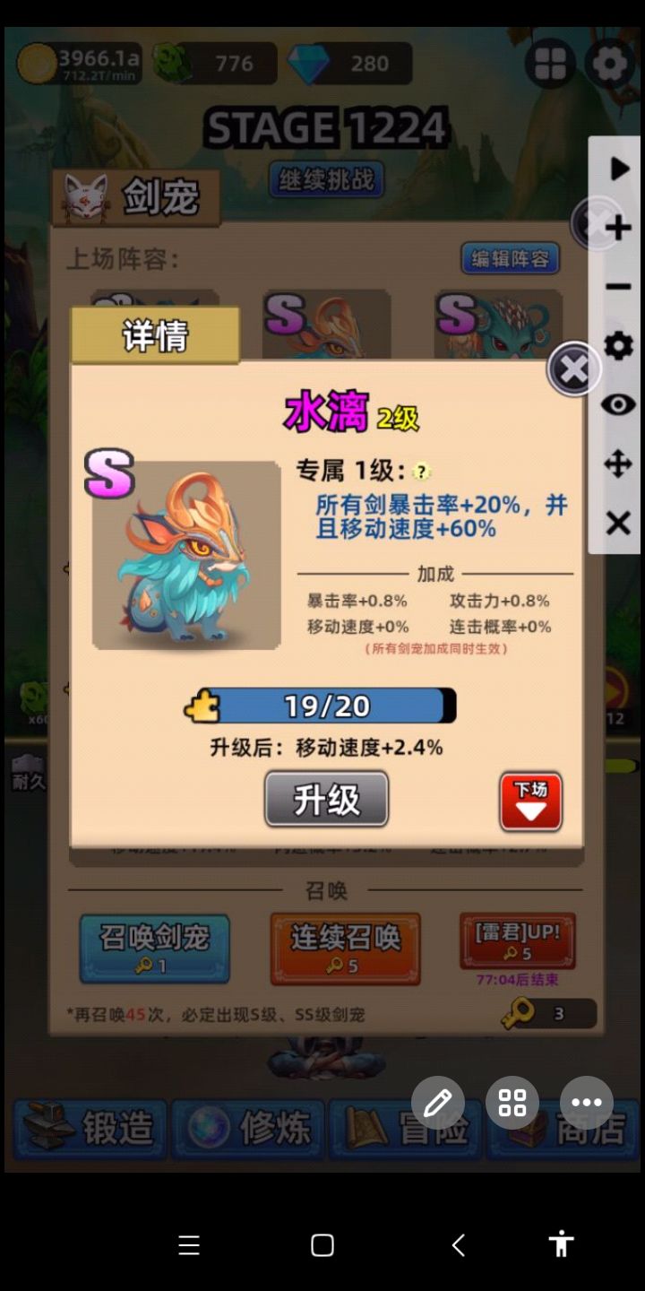 水漓s宠很有用1级加60百分之的移速,在线必须要有的神宠,抽到能提高1分3的金币