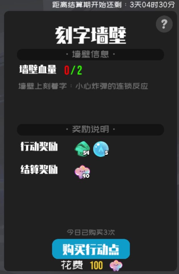 二 :每次行动都会有奖励,行动体力可以花一百购买,超过一百不介意购买,体力第二天刷新记得用了。(奖励还行不会太亏)