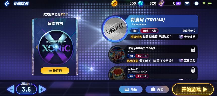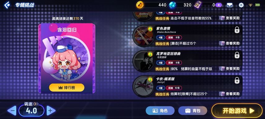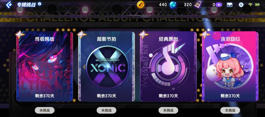 专辑挑战为线性闯关,每个专辑为独立的关卡完成全部曲目视为挑战成功,同时专辑挑战将会进行轮换,每张专辑设有挑战时间。