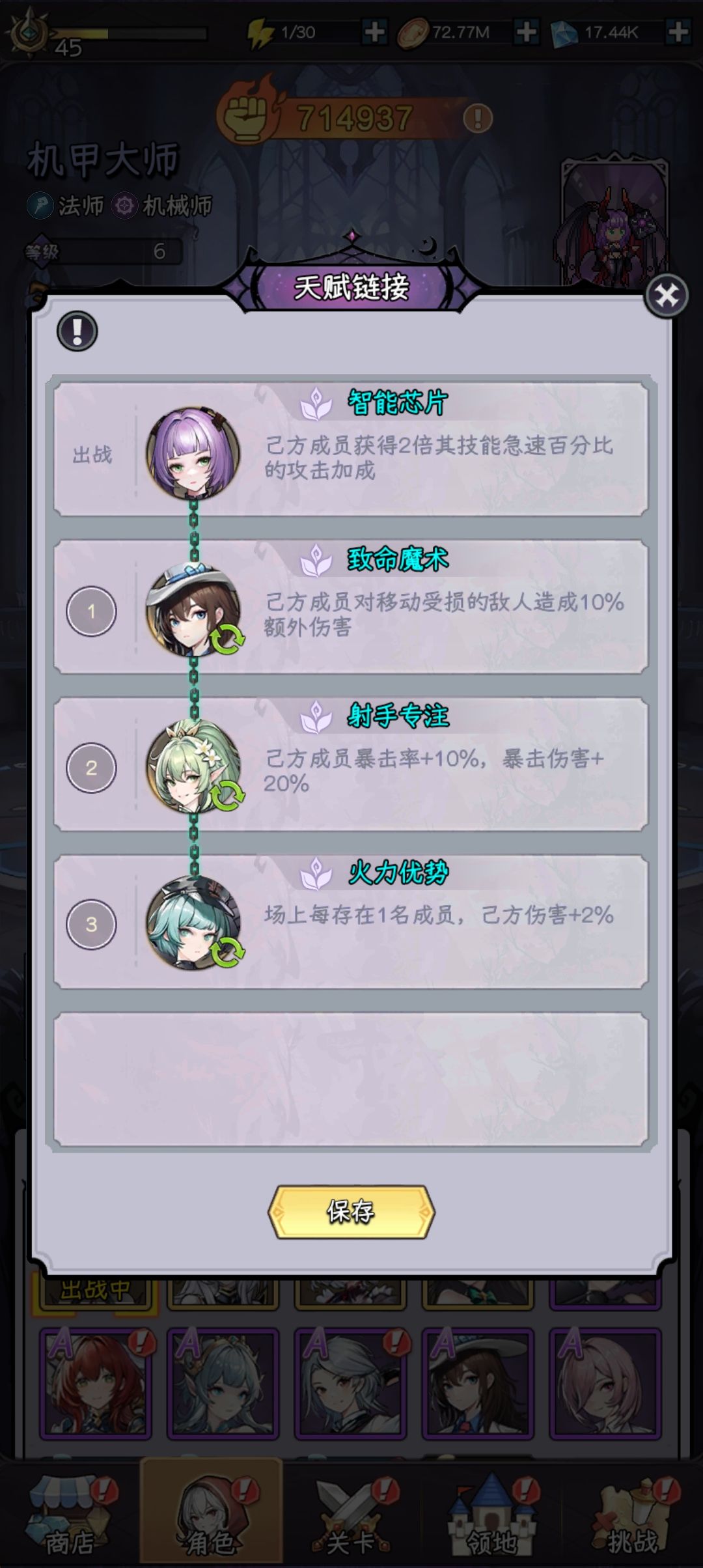 机甲大师!他可以同时吃到法师和机械的所有技能加成!所以他是我们的主C!指挥官链接!如果有剑仙,就把致命魔术去掉!如果一个除了机甲,一个s指挥官都没有!那就选择图六天赋链接!