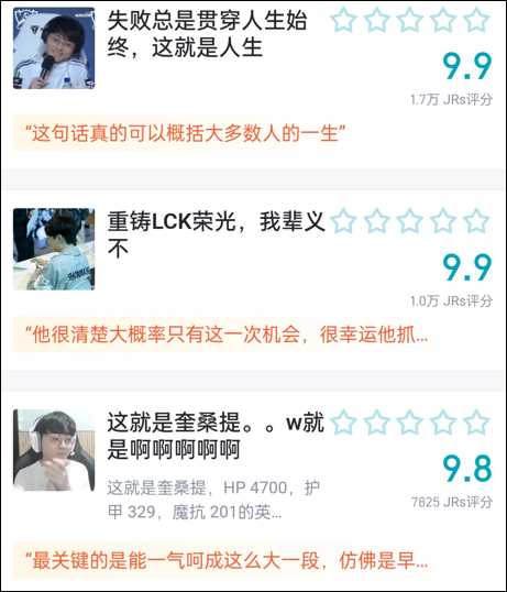 当然,评分也可以用来被表明某些态度。在“英雄联盟台词”中,腕豪的那句“爱你,老妈”就胜过了各种华丽的辞藻,几十万人打分最后依然是十分的满分。