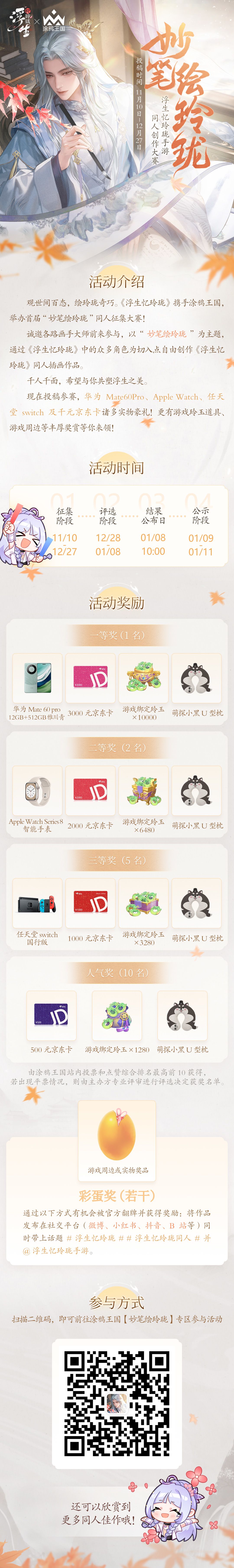 《浮生忆玲珑》携手涂鸦王国,举办首届“妙笔绘玲珑”同人征集大赛!华为Mate60pro、AppleWatch、Switch及千元京东卡等超多好礼等你来赢取,诚邀各位画手大大前来涂鸦王国「妙笔绘玲珑」活动专题参与比赛~