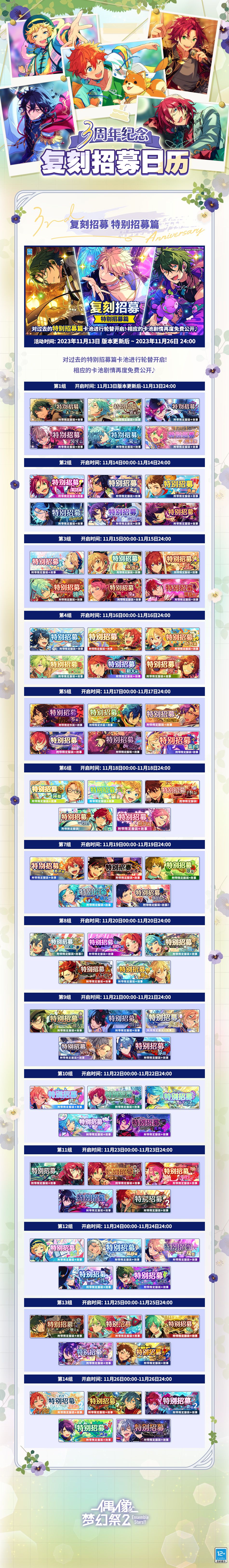 11月13日版本更新后~11月26日24:00,对过去的「特别招募篇」卡池进行轮替开启!相应的卡池剧情会再度免费公开。