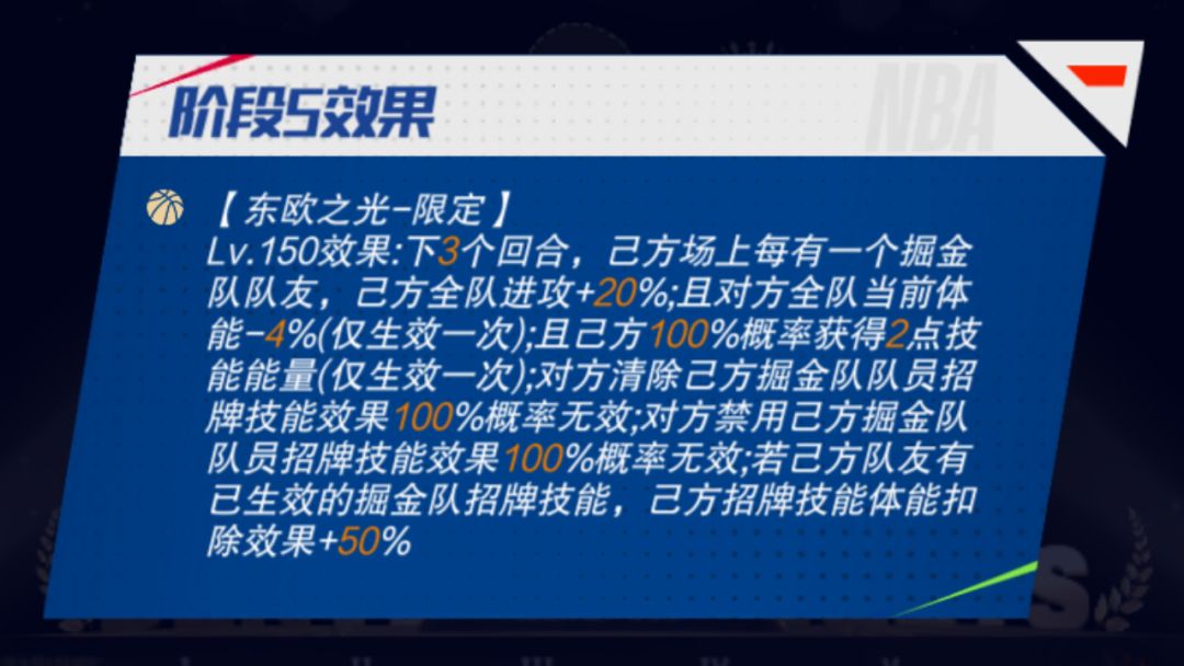 东欧之光:下X个回合,己方场上每有一个掘金队队友,己方全队进攻+X%;且对方全队当前体能-X%(仅生效一次);且己方X%概率获得Y点技能能量(仅生效一次);对方清除己方掘金队队员招牌技能效果X%概率无效;对方禁用己方掘金队队员招牌技能效果X%概率无效;若己方队友有已生效的掘金队招牌技能,己方招牌技能体能扣除效果+X%。(预计在上线同时开启迈向巅峰)