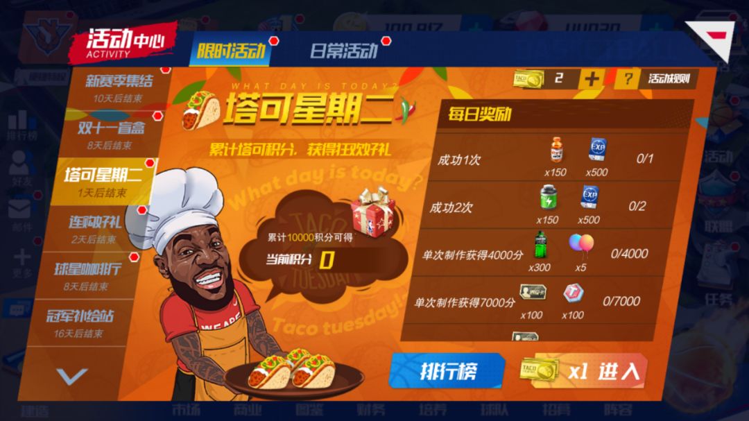 塔可星期二上线!经理人们又可以和詹姆斯一起制作美味又健康的塔可,赢取丰富奖励!(活动中赠送的气球可在【新赛季庆典】中使用!)
