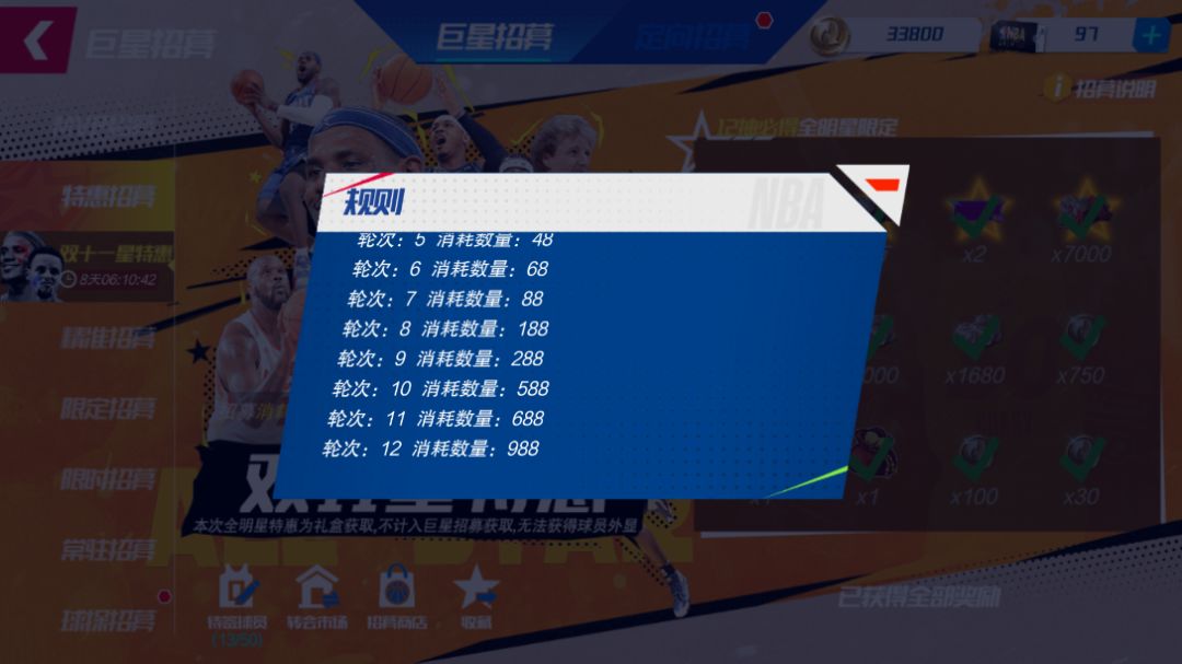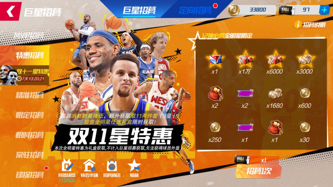 Tips:本次全明星特惠为礼盒获取,不计入巨星招募获取,无法获得球员外显,全明星球员可以在自由市场售卖。