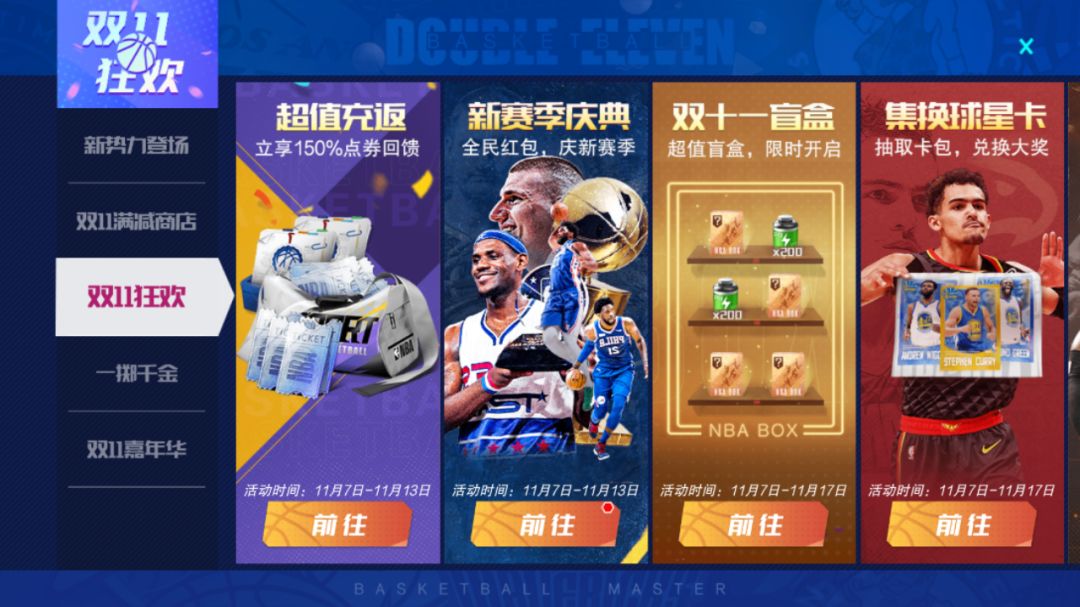 双十一特别卡池,全明星球员价格直降,机会难得!活动期间,可使用【精准招募函】在【精准招募-双十一星特惠】池中,获取全明星球员任选礼盒。卡池中还包含“财源滚滚”外显两件套(头像、气泡框)。