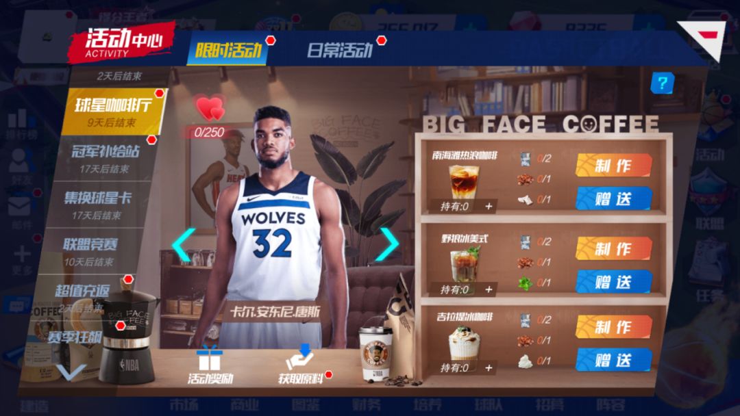 巴特勒的咖啡庄园正闹得热火朝天,特邀几位风云球星共度美妙时光。亲手炮制多款独具风味的珍品咖啡,待球员品尝,品味不同的咖啡旅程。随着每位球员个性独特,对咖啡的钟爱亦各异,只有当球员满意度达到一定要求,方可于“活动奖励”中领取丰厚奖励。(球星咖啡中可以获得【双十一满减券】,可用在双十一满减商店! )