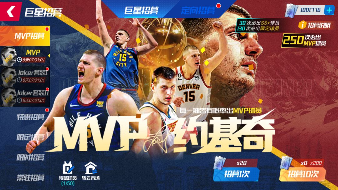 MVP卡池全员首次十连免费!至多抽取250次,成功将MVP约基奇签约入队!130抽必出SS+限定球员,每30抽必出大师球员!抽中MVP约基奇即可在称号活动【人类五花肉精华】领取五件套外显!(称号、头像、头像框、背景板和专属球员形象)