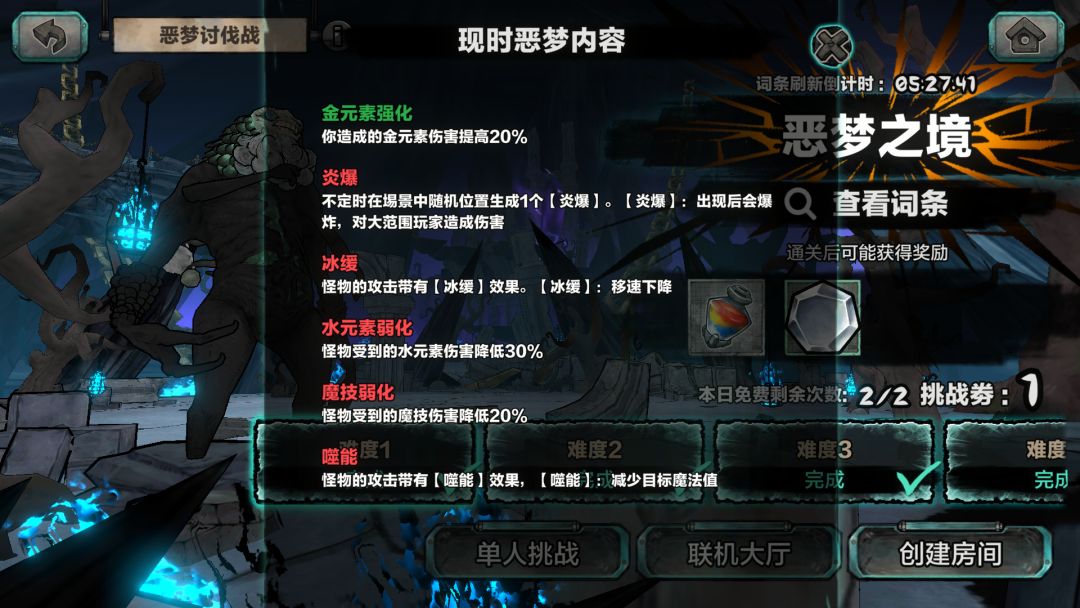 恶梦之境支持单人挑战、联机挑战,冒险家们可以选择合适自己的方式进行Boss挑战。击杀Boss后可获得附魔材料奖励。首次通关还可获得水晶奖励。