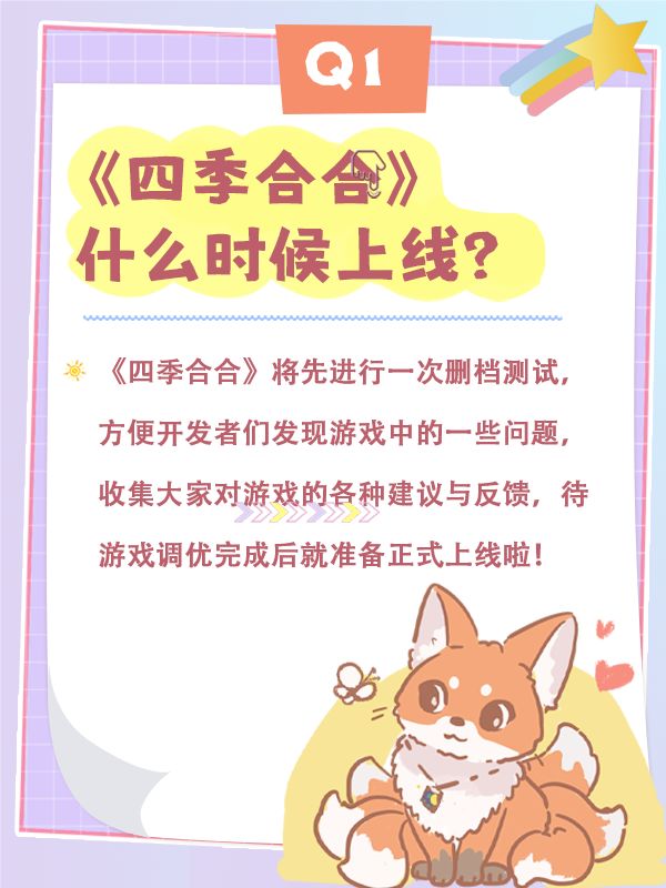 A1 《四季合合》将先进行一次删档测试,方便开发者们发现游戏中的一些问题,收集大家对游戏的各种建议与反馈,待游戏调优完成后就准备正式上线啦!