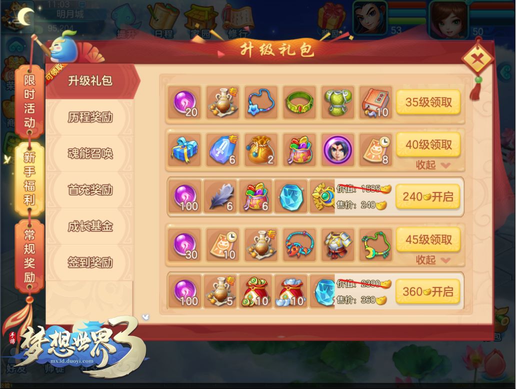 玩家从30级开始,每提升一定的等级都可以领取对应的升级礼包,不仅有飞翔之羽、还童丹、大修炼丹等常规道具,还有精灵护符、奇珍异石、通灵符等珍稀道具!