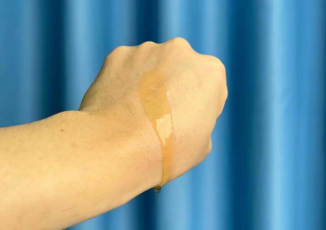 先看质地,浅黄色水乳的质地,富有流动性,带点粘感,推开不可以拉丝,没有颗粒磨砂感。