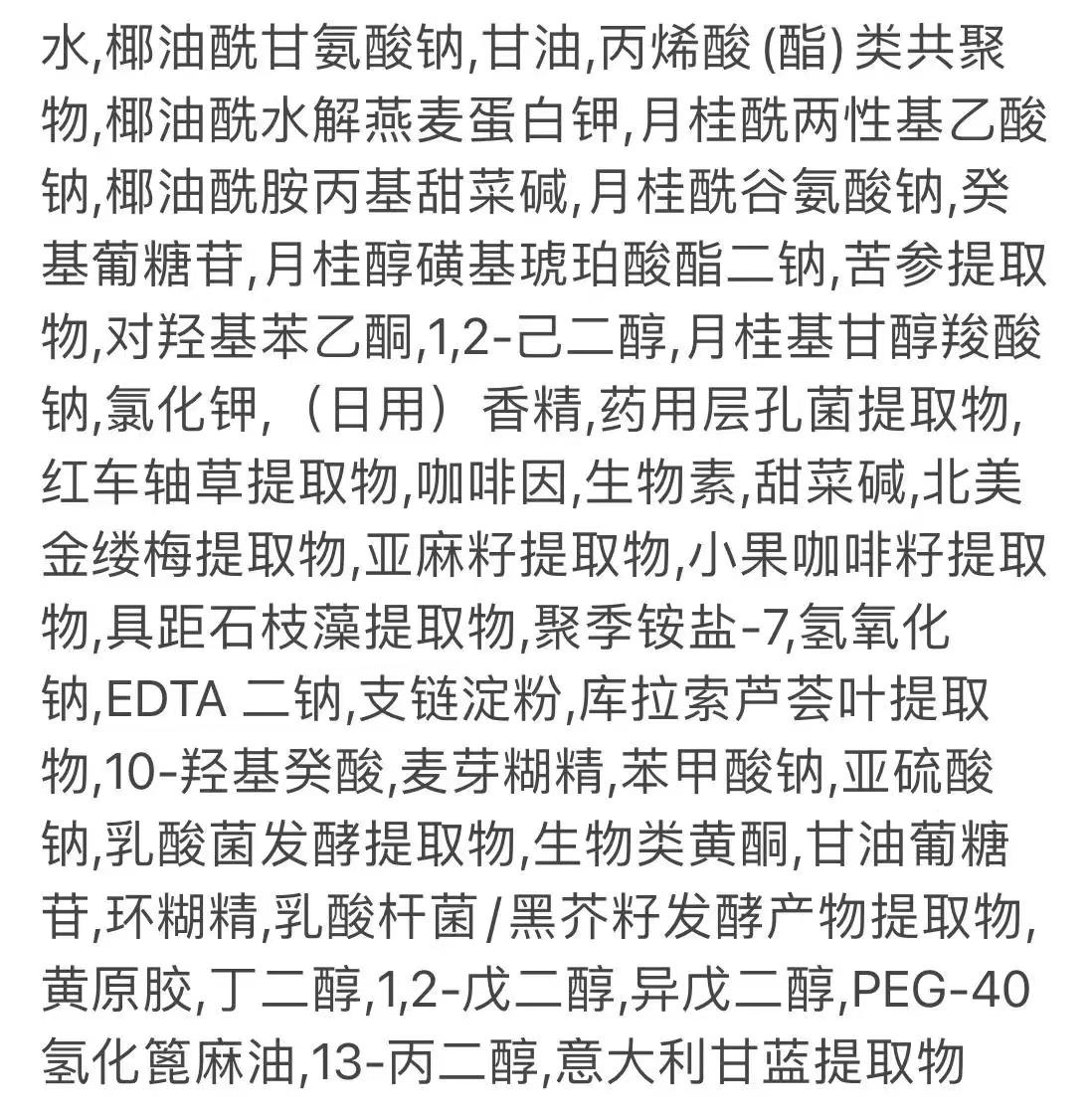 再看看成分,清洁主体是氨基酸表活,椰油酰甘氨酸钠,辅助表面活性剂是7种较为温和的表活,清洁体系稍显复杂。无色素,有香精的添加,低刺激的苯甲酸钠,构成了防腐体系。