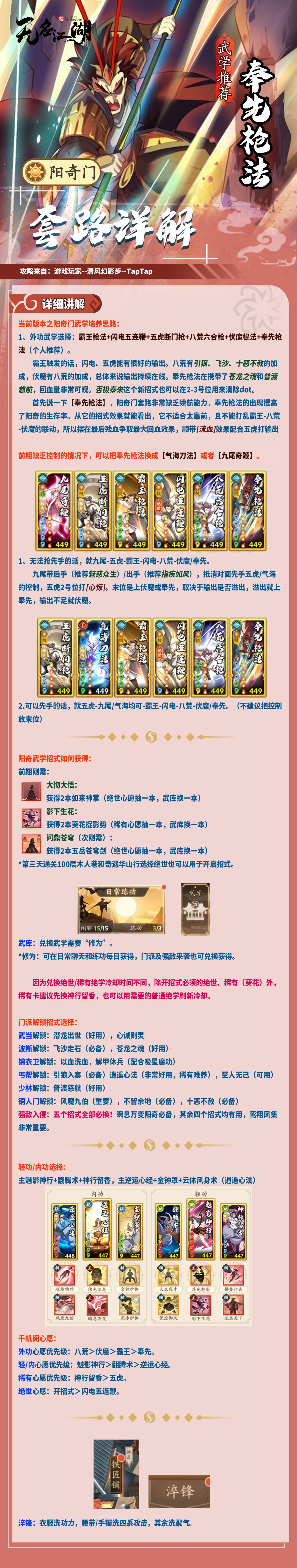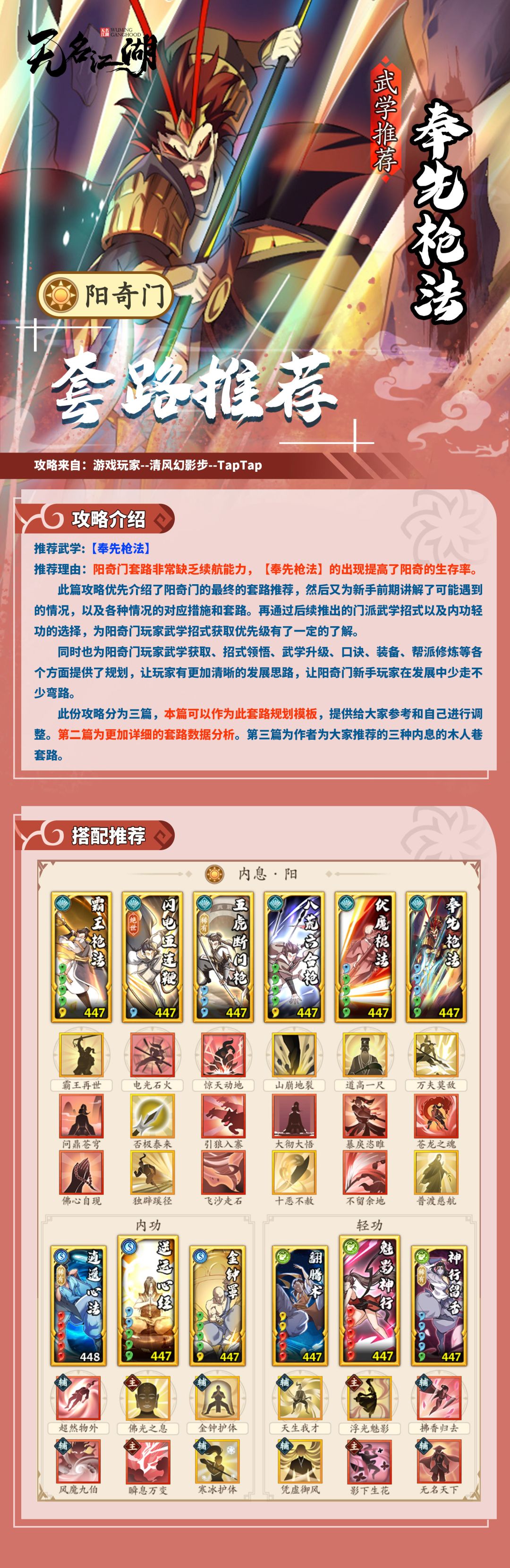 本篇攻略为大家整理了阳奇门套路推荐及奉先枪法分析。本次根据原作者攻略内容分为三张长图,套路推荐、详细讲解和挑战木人巷套路,朋友们根据需求查阅即可。武学理解可能存在偏差,欢迎指正和评论区提问。