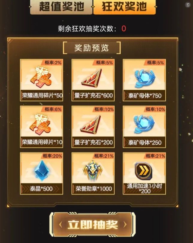 活动期间,玩家每消费满500元,即可额外获赠超值奖池一次抽奖机会,超值奖池单用户抽奖上限150次;玩家每消费2000元,可额外获赠狂欢奖池一次抽奖机会,狂欢奖池单用户抽奖上限40次;两个奖池总计抽奖上限为190次,抽奖资格仅限活动期间生效。
